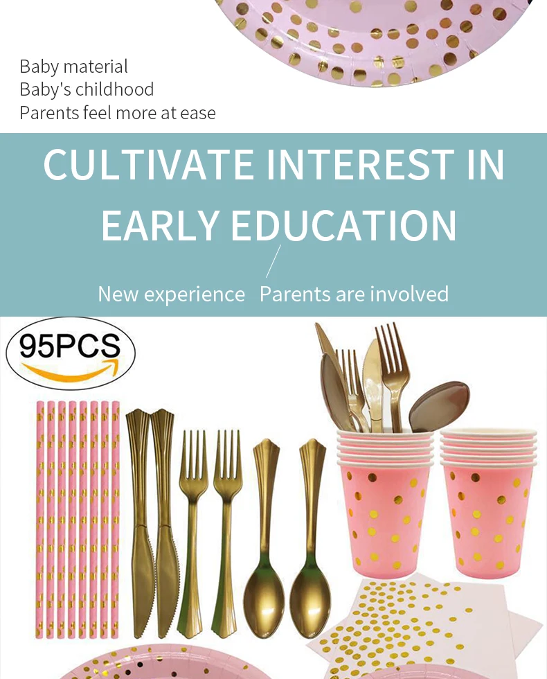 Позолотой розового цвета в горошек одноразовые набор столовых приборов вечерние украшения бумажный стаканчик, тарелка душа ребенка дети девушка посуда для вечеринки в честь дня рождения вечерние столовые приборы