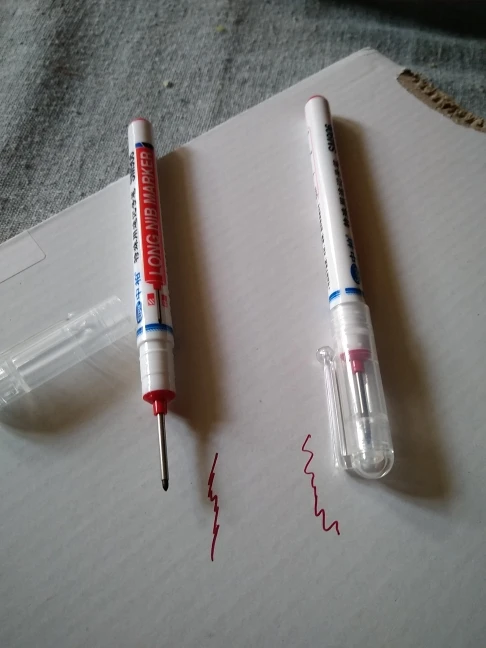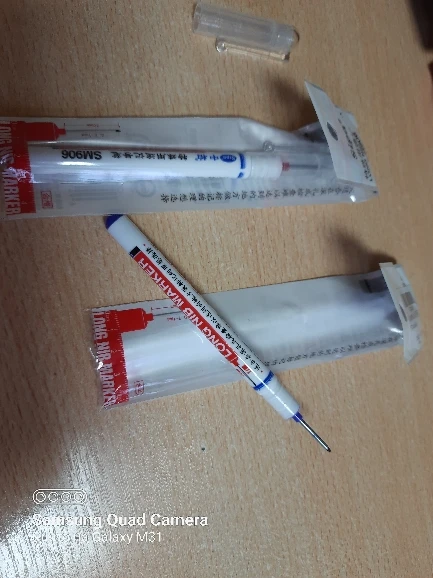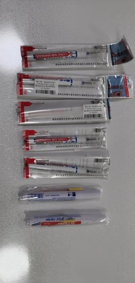 Посылка пришла за месяц, упаковано в полиэтиленовый пакет. Маркеры хорошего качества, пишут отлично. Действительно очень удобно размечать отверстия, когда наконечник такой тонкий и длинный. Рекомендую к покупке и буду заказывать снова!