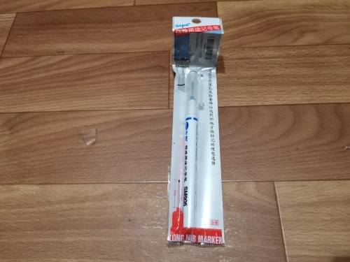 Отличный маркер. Пишет отменно, тонкое основание - позволяет ставить отметки в труднодоступных местах, через узкие отверстия и т.д. То что надо.