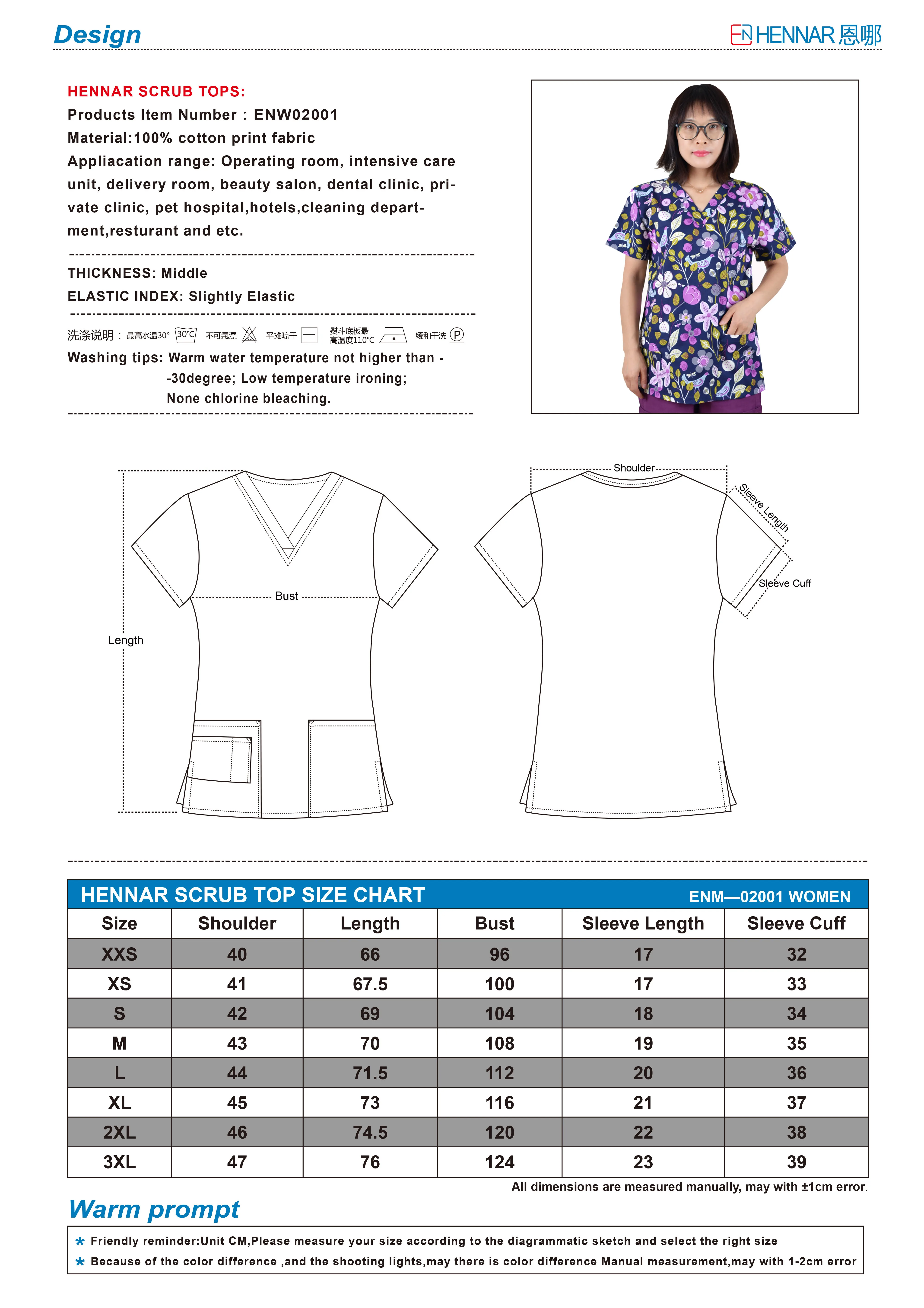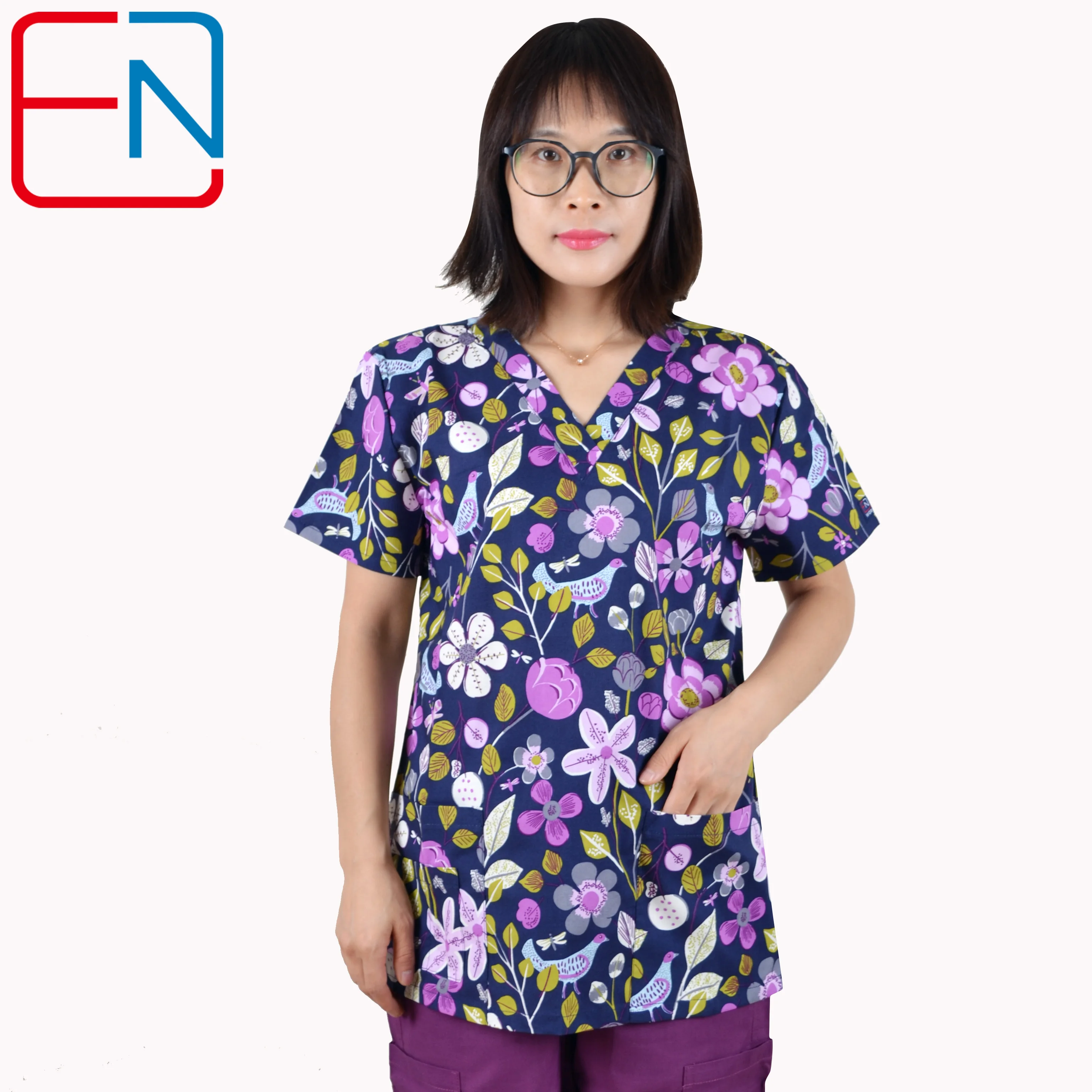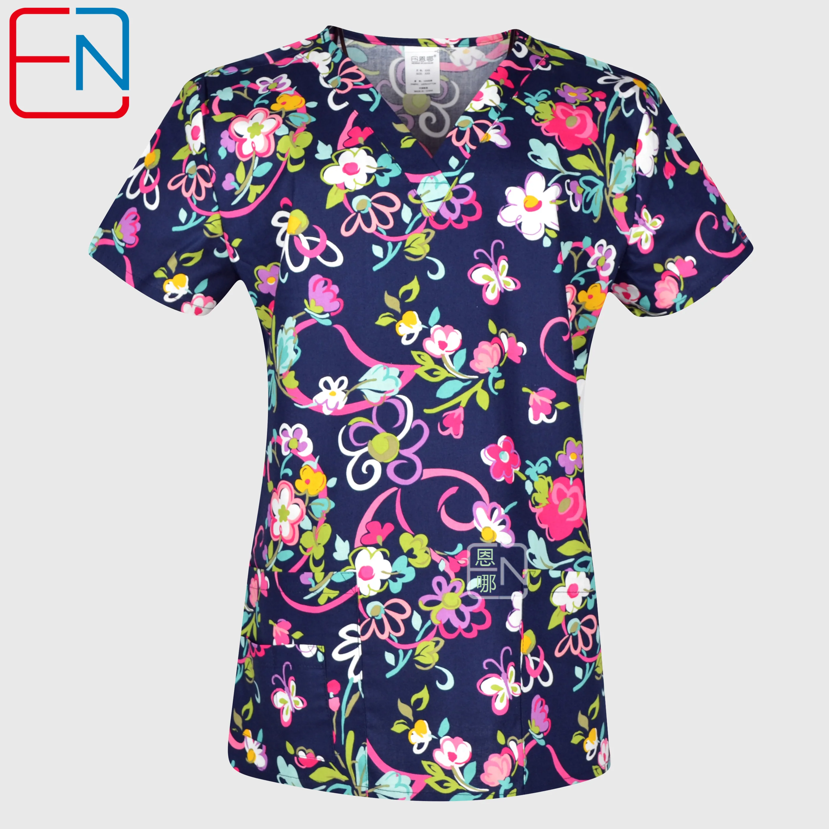 Hennar Для женщин скраб-топ 100% принт хлопчатобумажная Униформа с v-образным вырезом короткий рукав XXS-3XL больничный клинический scrubScrubs Топ