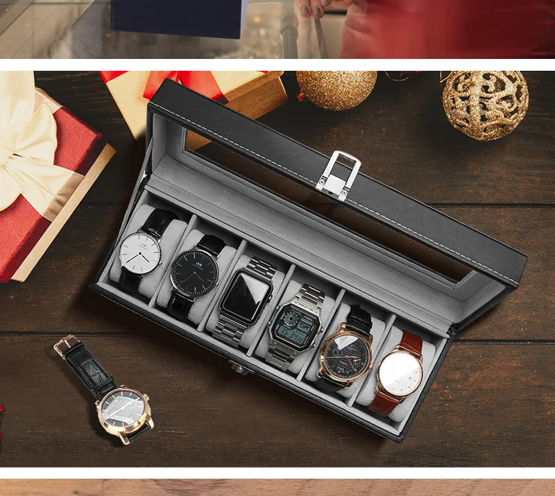 Коробка-органайзер для часов, премиум-кейс со стеклянной крышкой и замком для мужчин и женщин, черный держатель для часов и ювелирных изделий, 6 ячеек