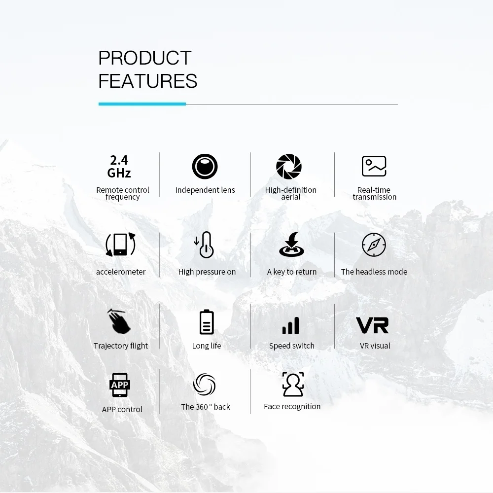 Функция: вверх и вниз, вперед/назад, влево/вправо поворот, боковой полет, 3 скорости полета, светодиодный свет, Безголовый режим, однокнопочный автоматический возврат, режим удержания высоты, мобильный гравитационный зондирующий полет, фото жестов, WiFi FPV передача в реальном времени