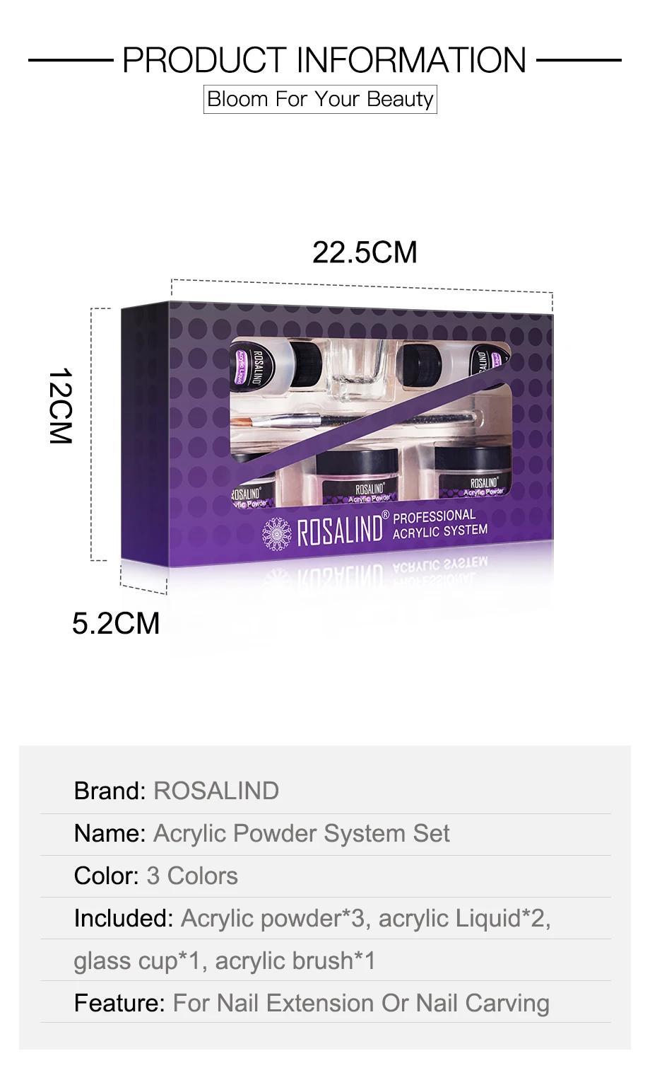 Характеристики Товара:Бренд: ROSALINDНазвание: кристаллический порошокОбъем: 10 г 30 гЦвет: 3 цветаИзлеченная: УФ/Светодиодная лампаИспользуется для: наращивания ногтей и резьбы ногтейВ комплекте: акриловый порошок * 3, акриловая жидкость * 2, стеклянная чашка * 1, акриловая кисть * 1Шаг за шагом:Шаг для наращивания ногтей:1. Нанесите базовый слой, вылечите светодиодный/УФ-лампой.2. Нанесите форму ногтя на ваш ноготь.3. Нанесите акриловый порошок акриловой жидкостью на гвоздь.4. Нанесите его на гвоздь. Подождите, пока он высохнет.5. Снимите форму ногтя.6. Обрежьте форму ваших ногтей.7. Нанесите верхнее покрытие, вылечите светодиодный/УФ-лампой.8. Отделка.Дизайн резьбы по ногтям шаг:1. Окуните кристаллический акриловый порошок акриловой жидкостью кисточкой.2. Приклейте его к ногтю и вырежьте. Подождите, пока он высохнет.3. Нанесите верхнее покрытие, вылечите светодиодный/УФ-лампой.4. Отделка.Примечание:1. Чистый объем составляет 30 г. Поскольку емкость бутылки составляет более 30 г, Кристальный акриловый порошок не будет полностью заполнен бутылкой.2. Плотно закрываются. Хранить в недоступном для детей месте.