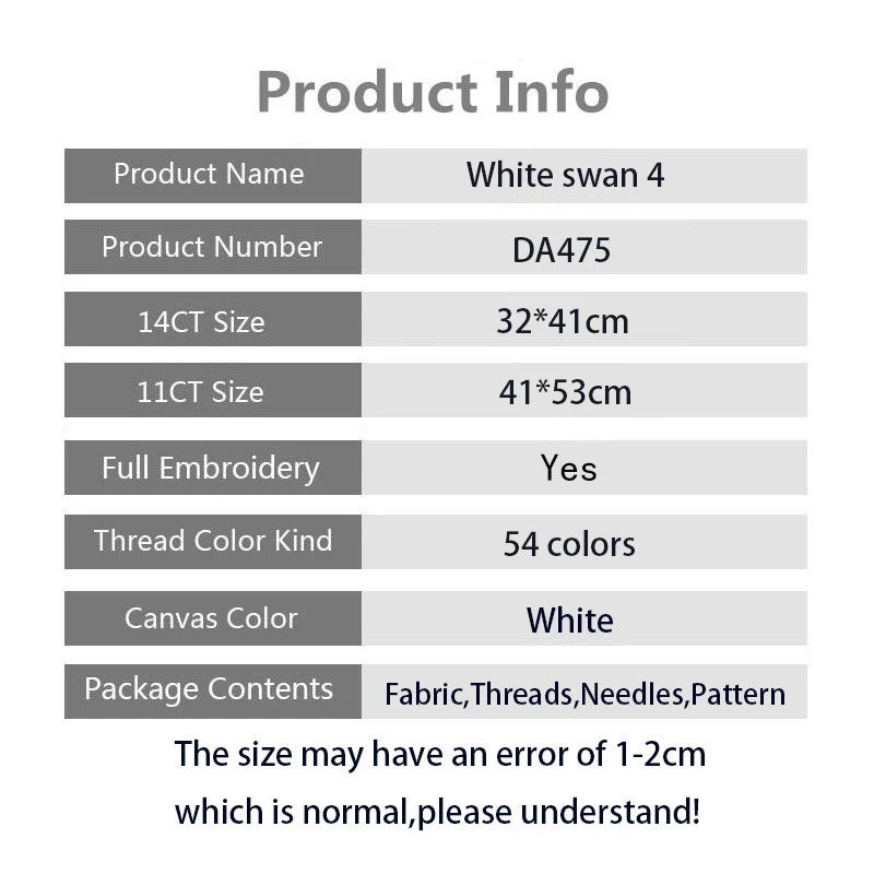 Ткань для вышивания: белый цветМатериал: 100% хлопокРазмер холста: 14CT:32*41 см11CT:41*53 смВопросы и ответы:1. Что такое холст с принтом?"Белый холст"-чистый холст."Набивной рисунок"-это набивной холст. Рисунок был предварительно напечатан на холсте, чтобы помочь определить различные цветные нити, его можно смыть после завершения всей картины. Это делает Вышивка крестом намного проще и быстрее.2. Что входит в комплект для вышивки крестом?Для телефонов с дигональю игл * 2Для телефонов с дигональю нити * достаточноДля телефонов с дигональю план * 1Ткань для вышивания * 1Вышивка крестом инструкция * 1(Без внешней рамы)3. Как выбрать нить для вышивки?Одна нить для вышивки может быть разделена на 6 нитей(1)14CT Используйте 2 нити, 1 нить для задней строчки.(2)11CT Используйте 3 нити, 2 нити для задней строчки.Для специальной части узора, пожалуйста, обратитесь к таблице и инструкции.4. Что такое половина стежка?Половина стежка наполовину крестиком, полный стежок.5. Что такое "КТ"?"CT"-это количество сетки в одном дюйме. Например, 11CT означает 11 сеток в один дюйм, 14CT означает 14 сеток в один дюйм. Поэтому по сравнению с 11CT, 14CT сетка гораздо меньше, законченный размер картины будет меньше.