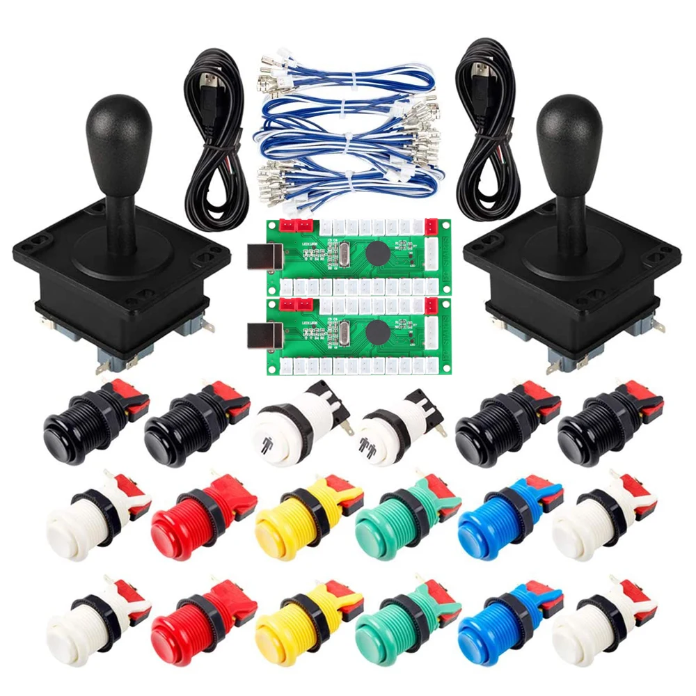 Комплекты включают 2 USB-кодировщика с нулевой задержкой, 2 джойстика в стиле HAPP, 16 аркадных кнопок в стиле HAPP и 1 кнопка запуска P/2P.