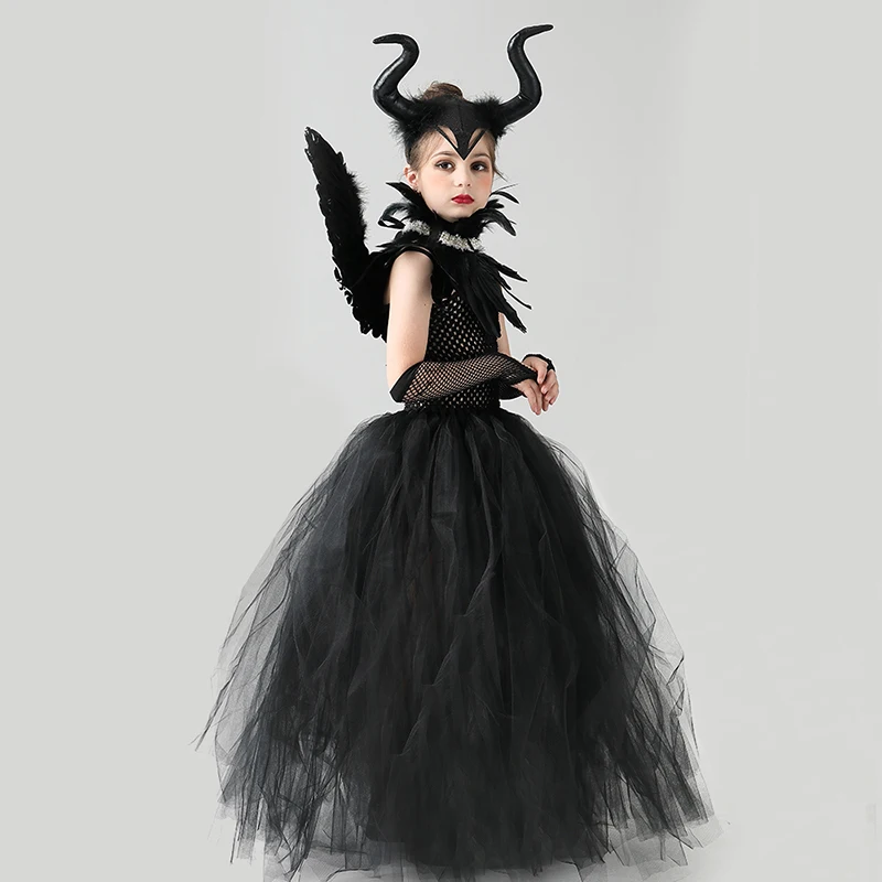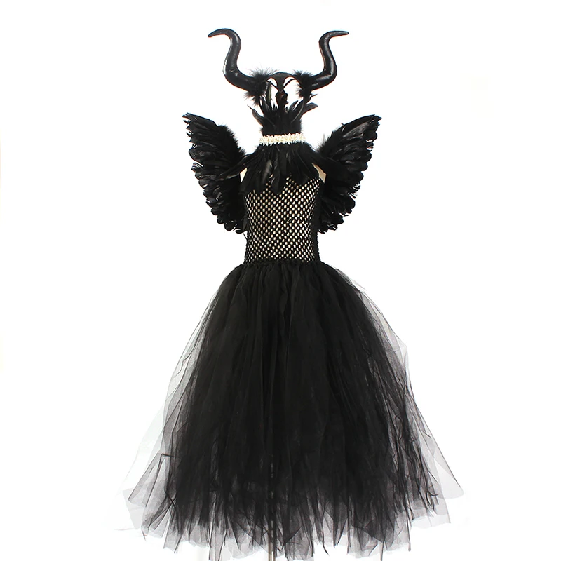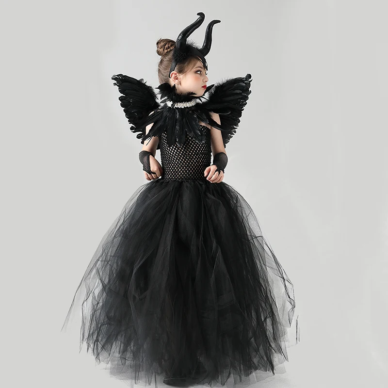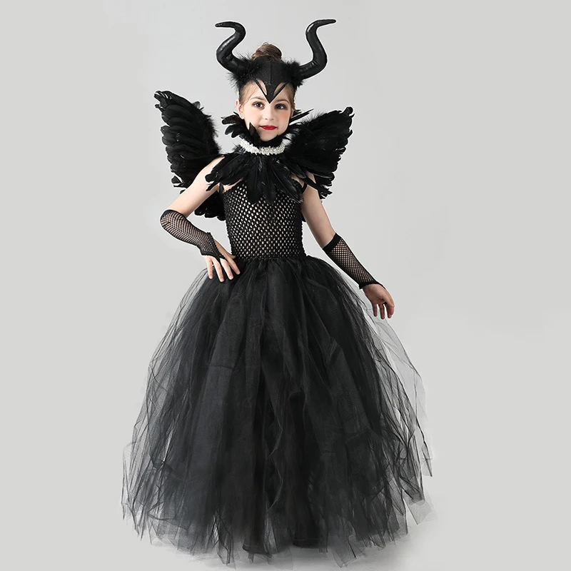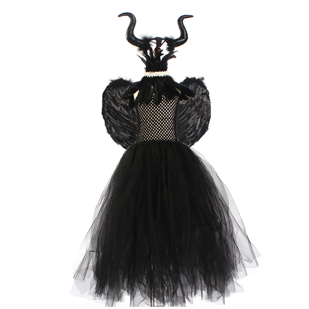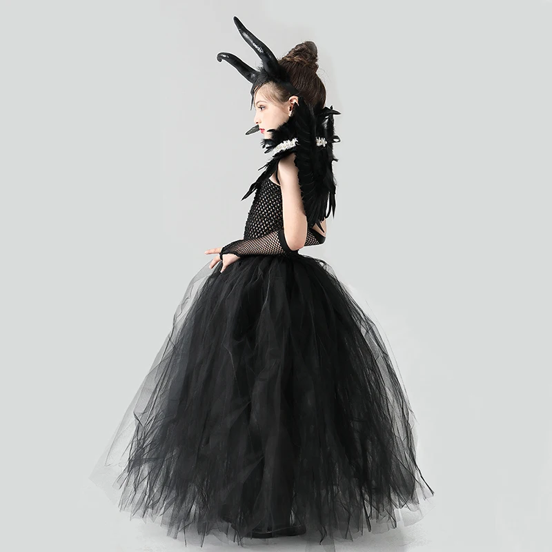 Костюм черного дьявола для девочек, готический костюм темного зла, ведьмы, королевы, пачка, накидка с перьями шаль