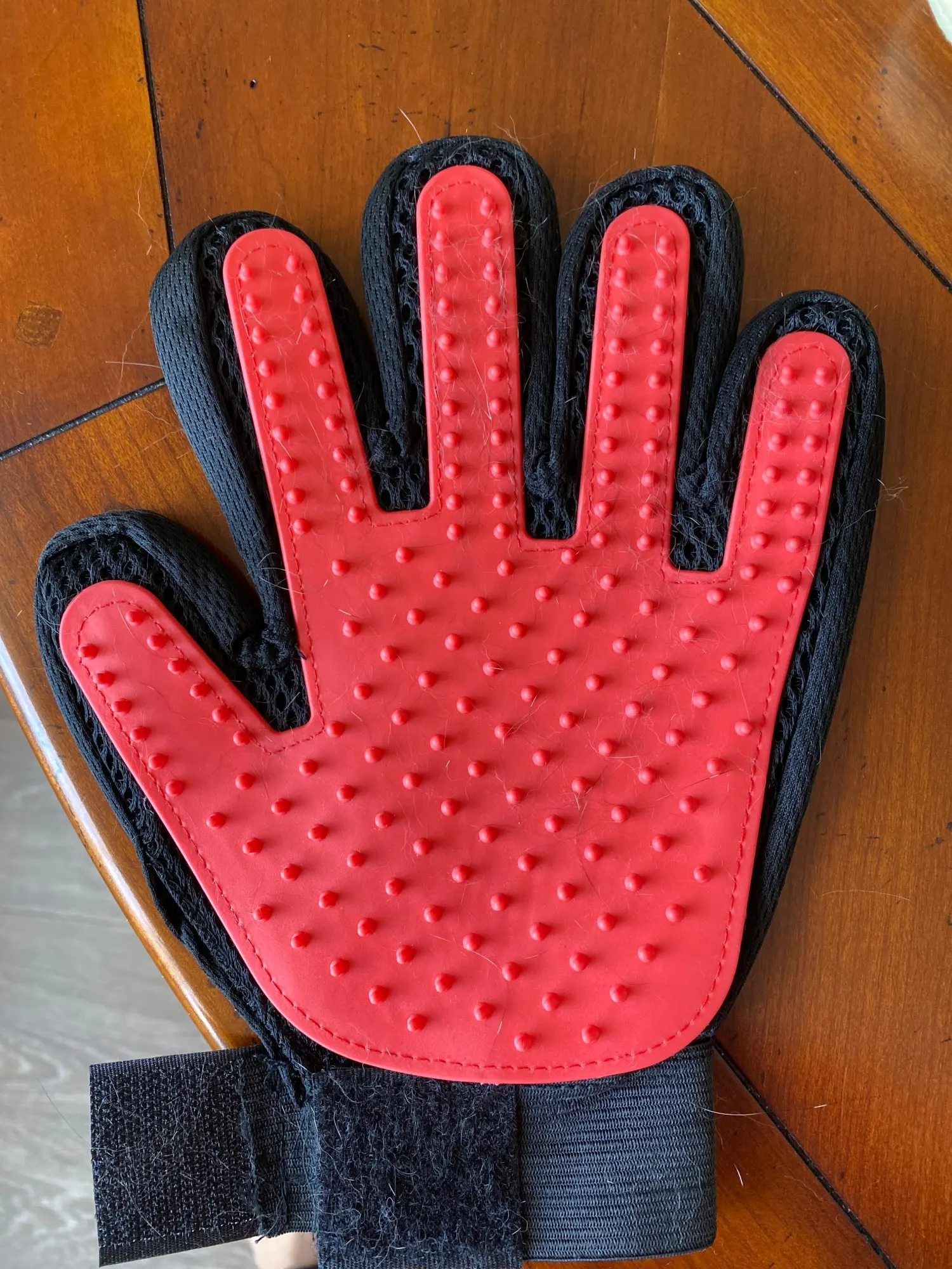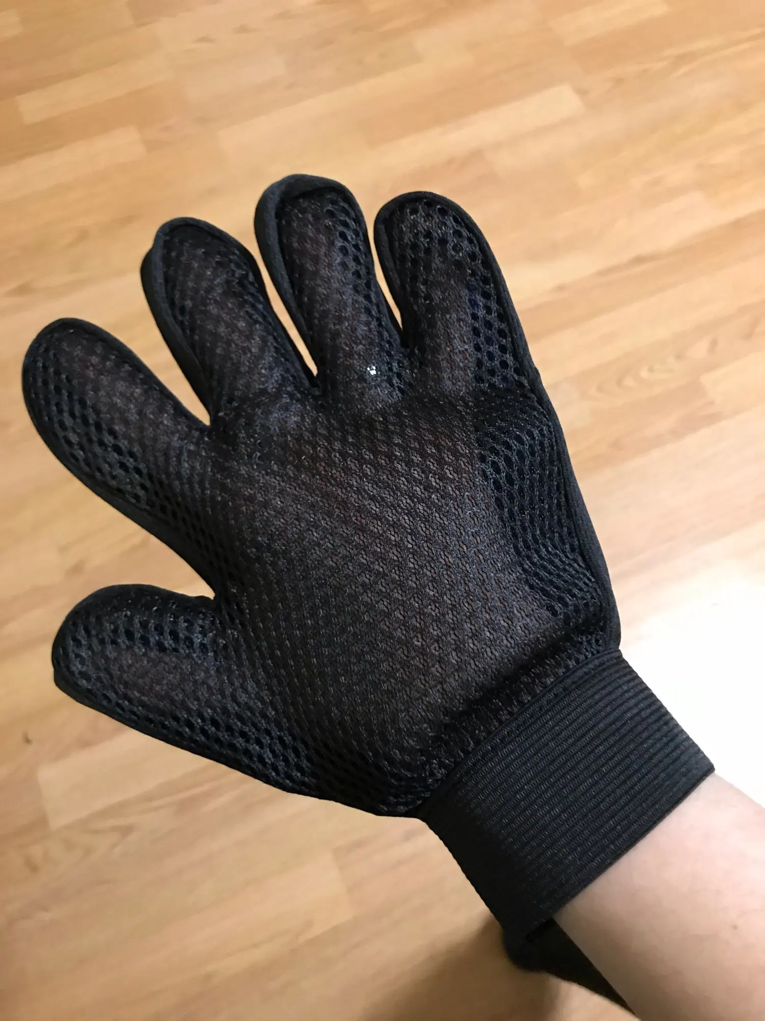 Как описано, подходит для средних/больших рук, хорошо прилипает к кошачьей шерсти, верхняя часть кармана сетки, что позволяет довольно удобно надевать и снимать, закрытие с липучкой.