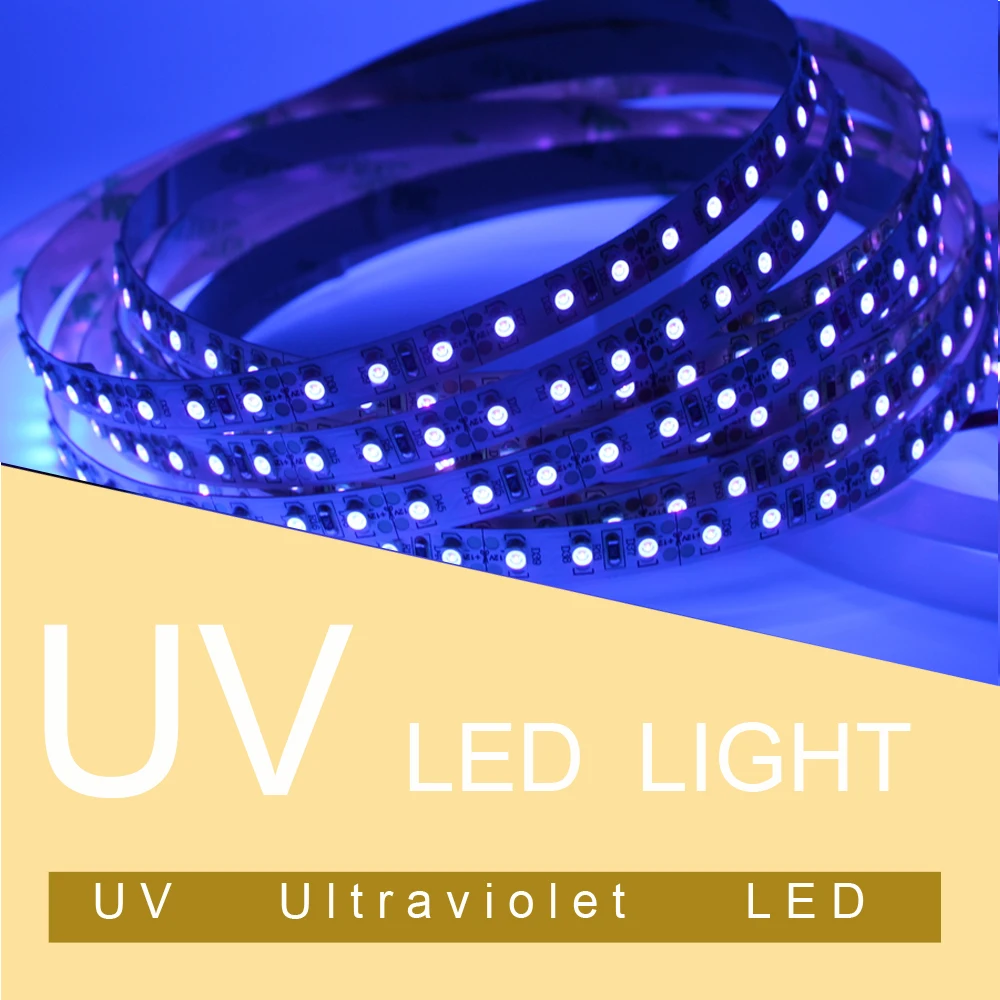 Сверхяркий 3528 SMD УФ-светодиодный ультрафиолетовый, высокая интенсивность и reliabilitВодонепроницаемая гибкая светодиодная лента120 SMD УФ ультрафиолетовых светодиодов на метрСамоклеящаяся задняя сторона с двусторонней клейкой лентойБесплатное обслуживание, простая установкаКаждые 3-светодиодный cutable, не повреждая остаток полосыГибкая лента для изгибаУльтра-яркий, но работает при низкой температуре