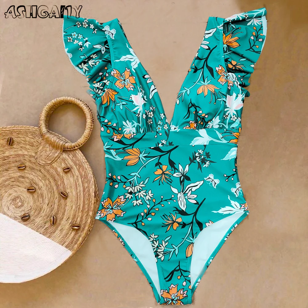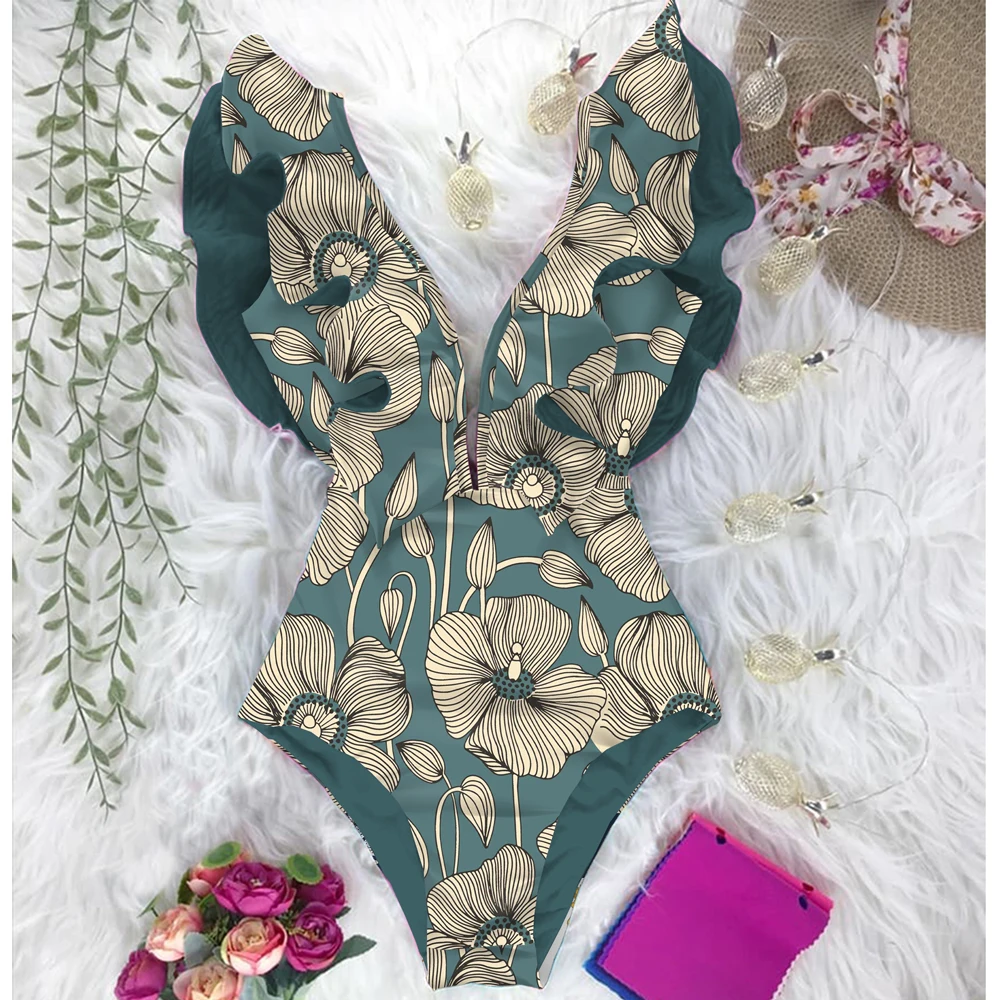 Слитный купальник с глубоким V-образным вырезом и рюшами, пуш-ап, с принтом, для пляжа, монокини с открытой спиной, 2022