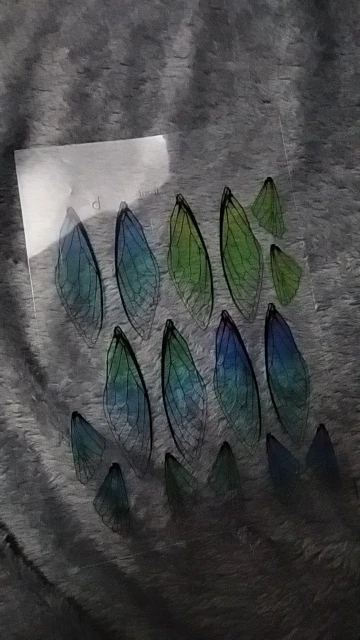 красивые крылья, укреплю их эпоксидный смолой. Сразу показалось что они напечатаны просто на бумаге но это была подкладка для яркости. пришли быстро и ровные