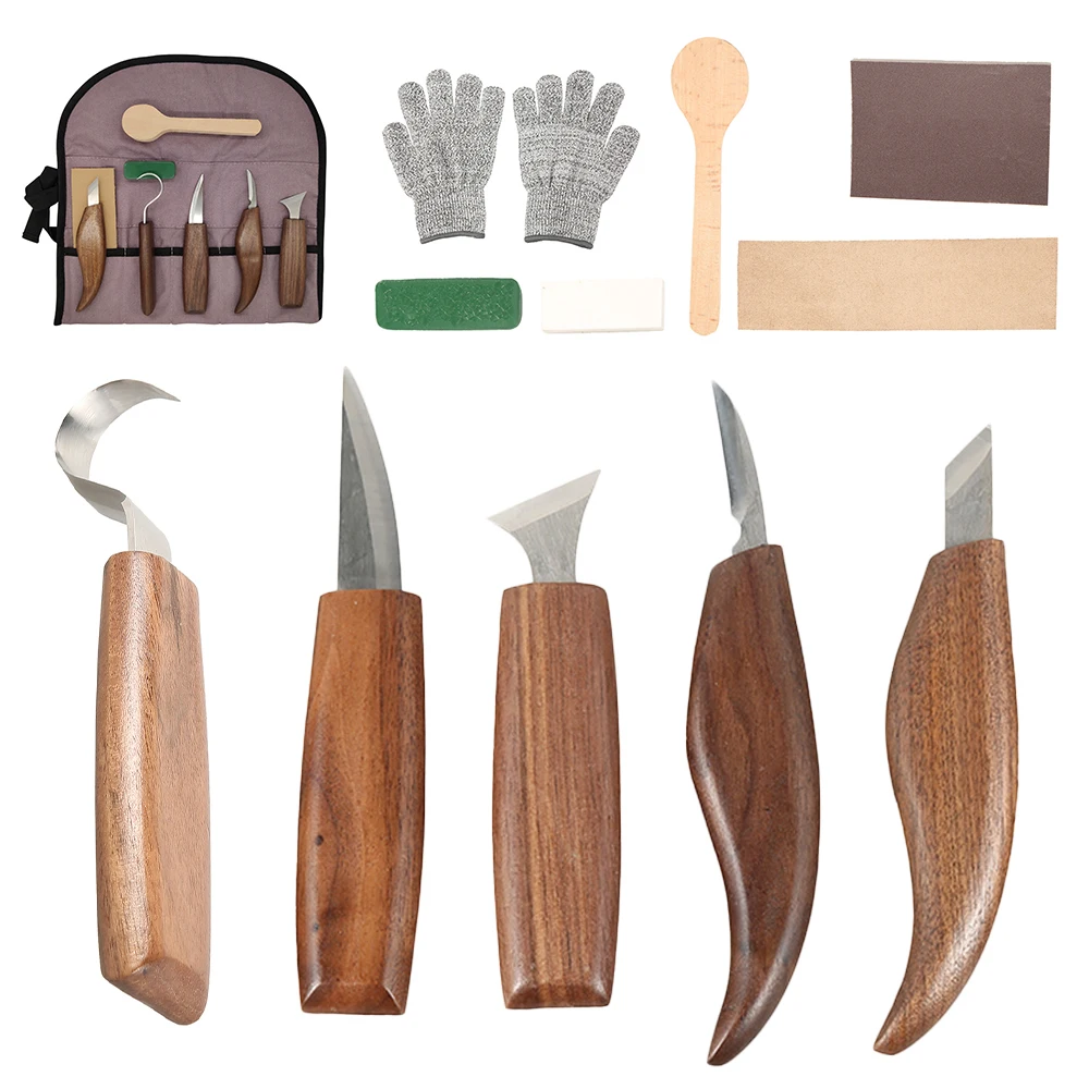 Хороший инструмент: Этот набор инструментов для резьбы по дереву включает нож для резки, резак для крючков. Универсальный резак, точилка, камень для ножей, перчатки, воск, мешок
