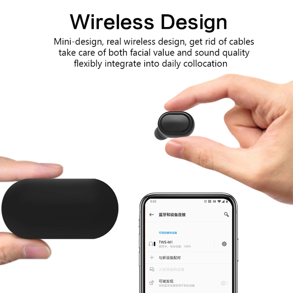 M1 TWS наушники-вкладыши Bluetooth 5,0 стерео беспроводные наушники-вкладыши с зарядным устройством Технические характеристики: Чип Bluetooth 5,0 обеспечивает сверхбыструю связь. Более быстрое сопряжение и более стабильное соединение. Поставляется с зарядным устройством большой емкости, вы можете заряжать наушники в любое время. Прекрасный подарок для ваших друзей или любимых. Название товара: беспроводные наушники Материал: АБС-пластик Рабочее напряжение: 3,3-4,2 в Версия Bluetooth: 5,0 + EDR Емкость аккумулятора наушников: 45 мА (входит в комплект) Емкость аккумулятора зарядного устройства: 350 мА (входит в комплект) Диапазон передачи: 2,40 ГГц-2,48 ГГц Время работы в режиме ожидания: около 60 часов Тип динамика: титановая композитная пленка Время использования: 3-4 часа Чувствительность: 98 дБ +/- 3 дБ Эффективное расстояние: 15 м Особенности: беспроводное соединение, Bluetooth, с зарядным устройством Размер зарядного устройства: 7,2 см x 3,8 см x 3 см/2,83 дюйма x 1,50 дюйма x 1,18 дюйма (приблизительно) Примечания: Благодаря светильник и экрана Цвет Товара может быть s светильник ly отличается из-за характеристик монитора компьютера. Возможны незначительные отклонения в размерах вследствие разных измерений вручную. Посылка входит: Беспроводные наушники-2 шт. Зарядное устройство-1 шт. 1 x зарядный кабель 1 x Руководство пользователя