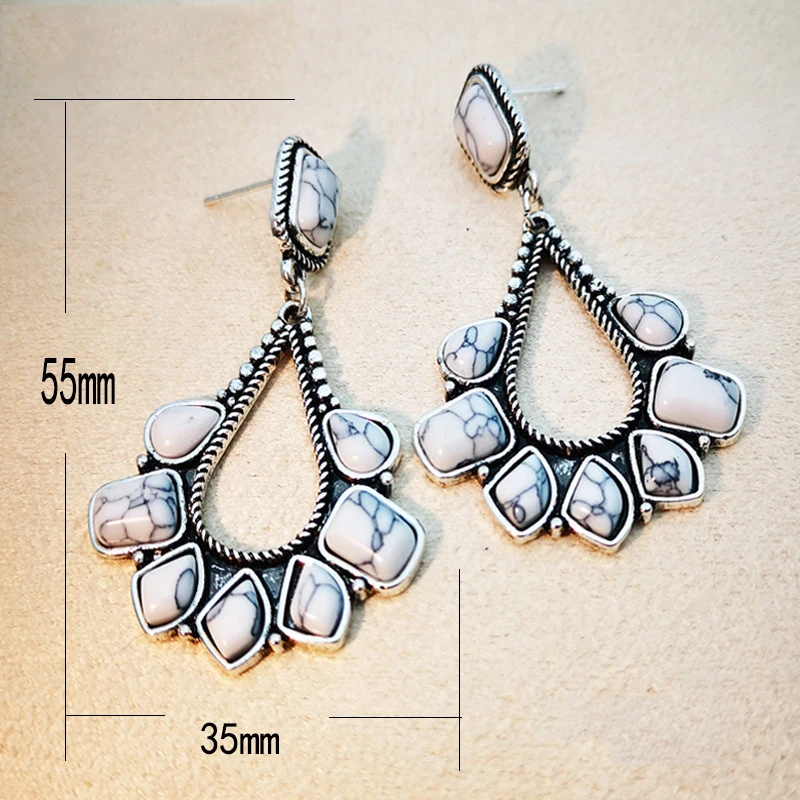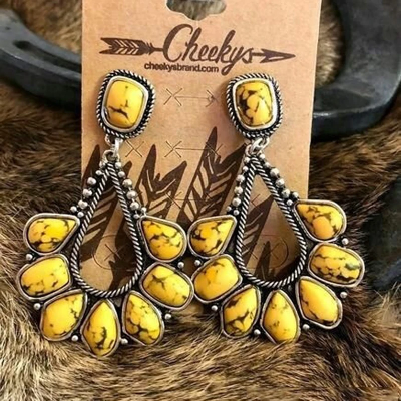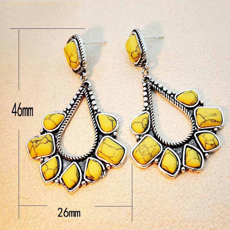 Винтажные бирюзовые желтые серьги из натурального камня для женщин, ювелирные изделия в стиле бохо, полый металлический цвет
