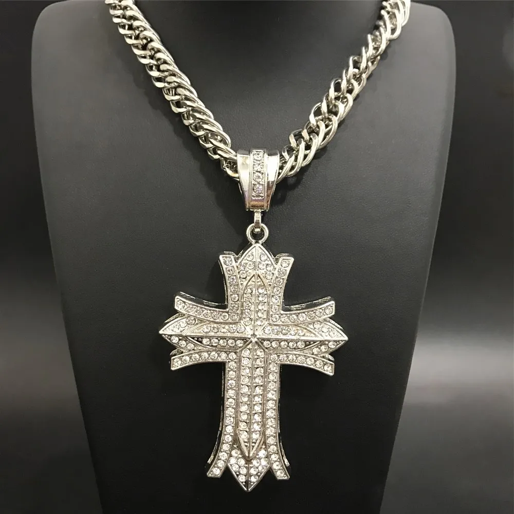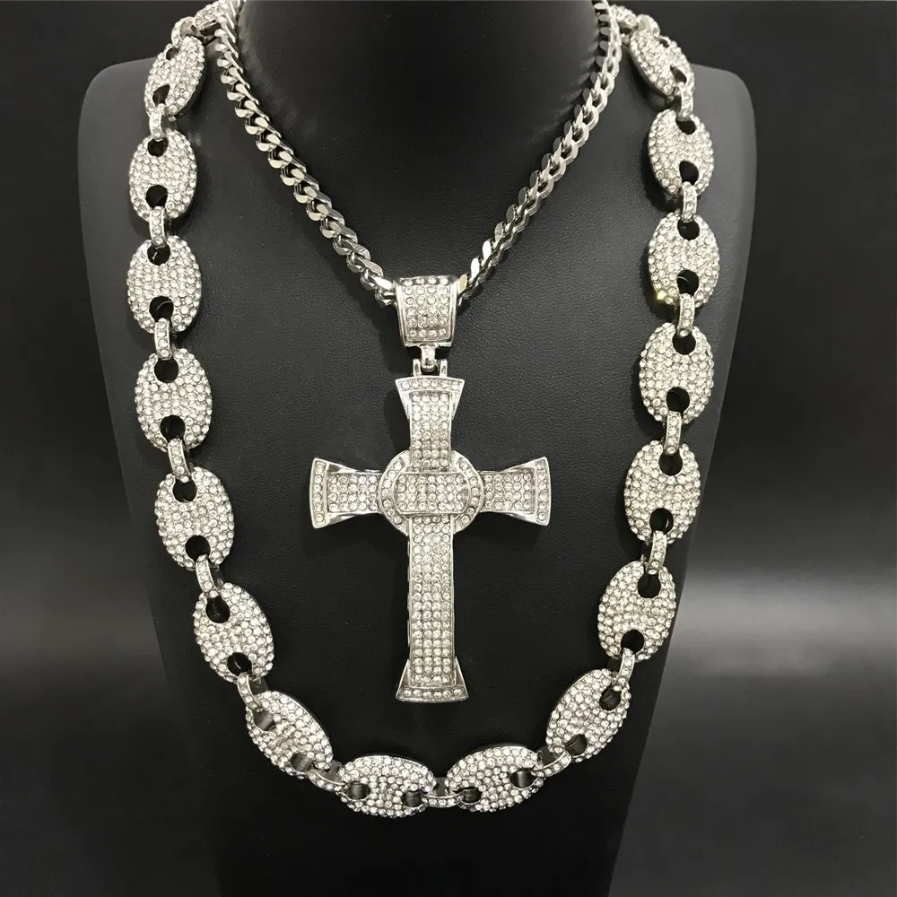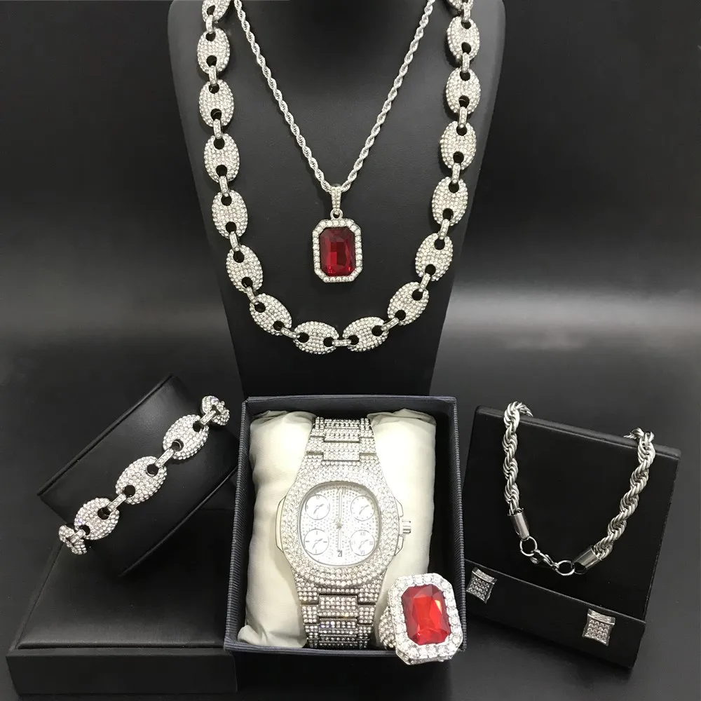 Роскошные мужские часы, ожерелье, кольцо и серьги серебристого цвета, комбинированный набор, кубинские украшения с кристаллами, ожерелье для мужчин