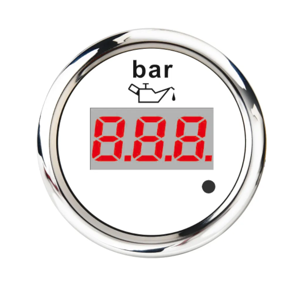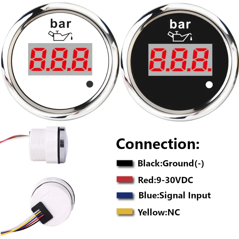 [1] фоновое освещение: красный светодиодный светильник, высокая яркость и долгий срок службы. [2] Диапазон измерения: отображение давления масла до 10 бар Макс (0-10 бар) [3] Материал: передняя крышка из нержавеющей стали 316 для долгосрочного использования, водонепроницаемость IP67 и степень защиты от пыли. Внешний корпус изготовлен из ПБТ + GF20 %, температура плавления 220 °C, циферблат изготовлен из поликарбоната. [4] Применение: широко используется в яхтах, моторных лодках, скоростных лодках и других связанных с ними кораблях; RVs, строительные механизмы техника, модифицированные транспортные средства, аккумуляторные транспортные средства, сельскохозяйственная техника, погрузчики и другие транспортные средства; механическое оборудование, такое как двигатели. [5] двухслойная противотуманная структура: высокопрозрачная изогнутая поверхность PC образует двухслойную противотуманную структуру с изогнутым стеклом. [6] сигнал тревоги: счетчик Поставляется с сигналом тревоги и не требуется дополнительный сигнал тревоги от датчика. [7] может сочетаться с различными датчиками сигналов: в дополнение к 0 ~ 190 Ω / 240 ~ 33 Ω, 0 ~ 5 В/0,5 ~ 4,5 В, 4 ~ 20 мА, также может быть подключен к любому аналоговому сигналу.