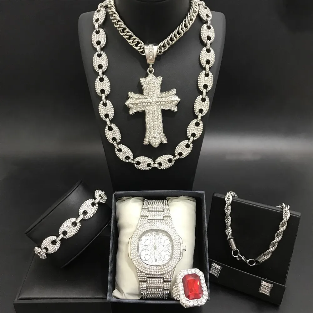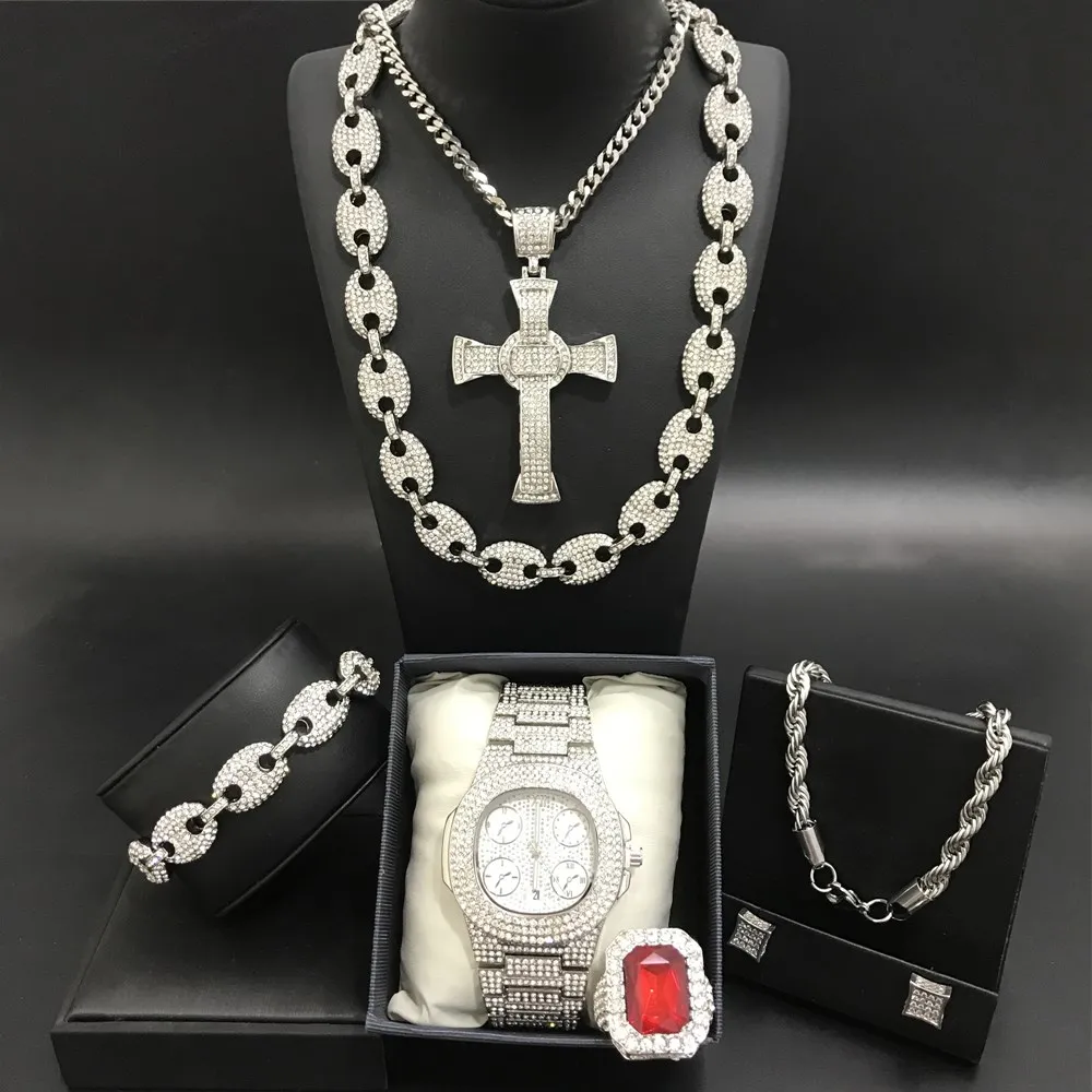 Роскошные мужские часы серебристого цвета, ожерелье, кольцо и сережки, комбинированный набор ледяных кубинских ювелирных украшений в кристальном галстуке для мужчин