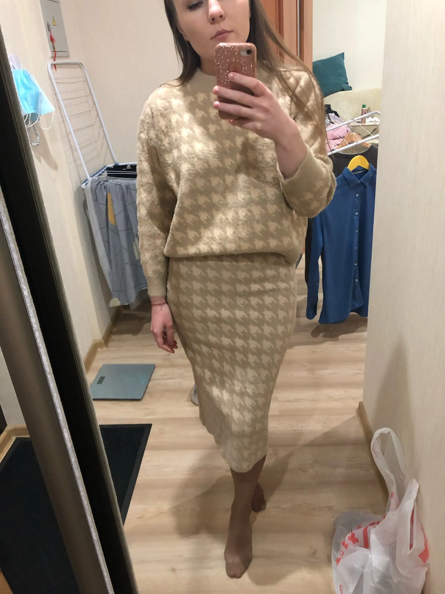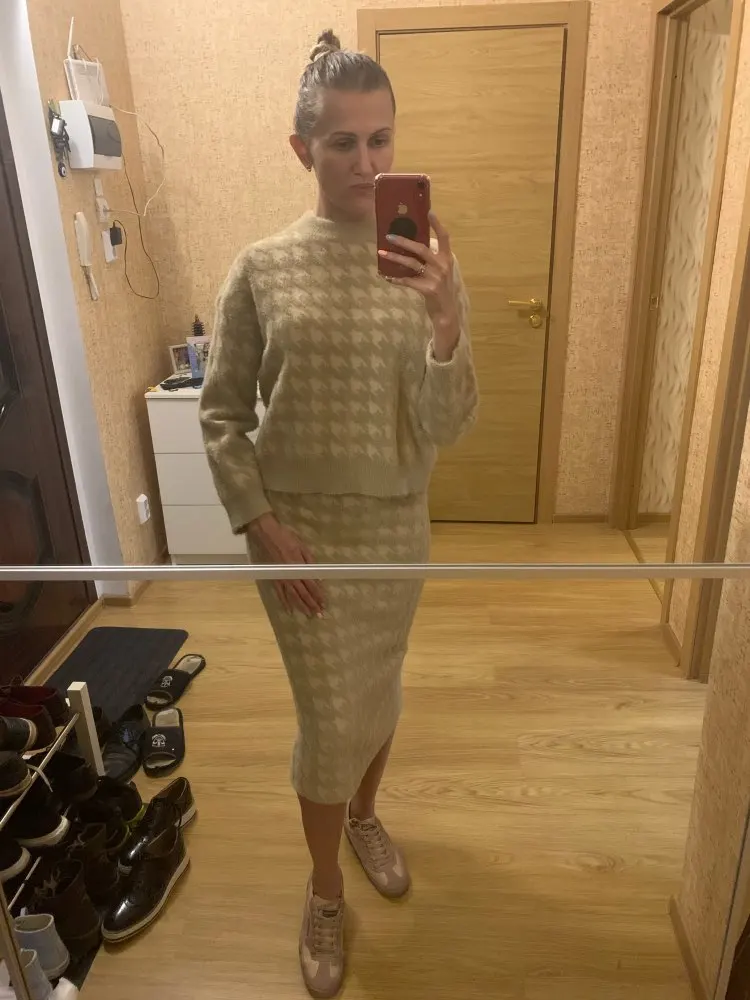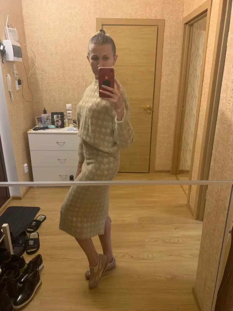 Костюм хороший, мягкий, пушистый без запаха, фото соответствует. Обратите внимание свитер и юбка оплачиваются отдельно, цена это за каждую вещь. Я на это не обратила внимание пришел свитер, потом пришлось дозаказывать юбку. Продавец отзывчивый, на связи.