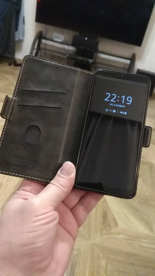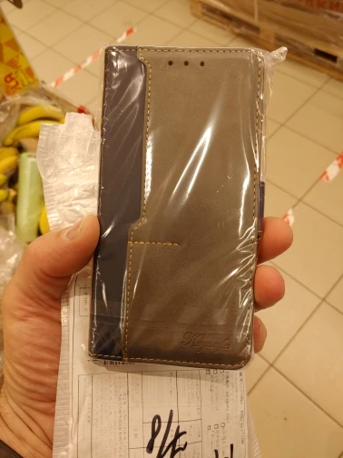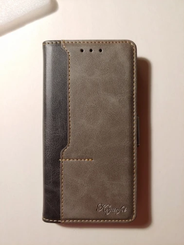 Красивый, удобный чехол для пользования вне дома. Продуманный дизайн. Смотрится в точности как на фото. Материал верха ПУ кожа, надеюсь, что она прочная, и на изгибах не истрепается