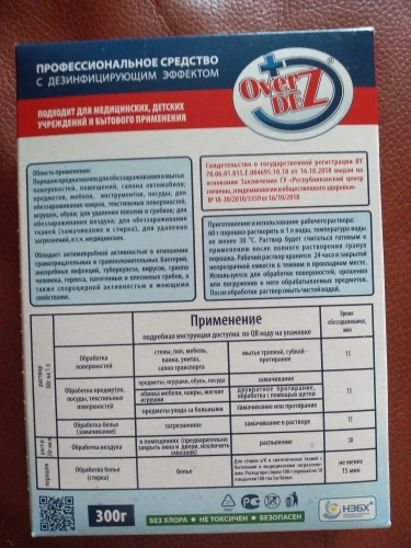 Описание от производителя: В бытовом использовании порошок Over Dez применяется для: 1. обеззараживания помещений, поверхностей, посуды, тканей: - снятие риска заражений членов семьи при наличии больного в семье; - профилактика при беспокойстве за ослабленного или новорожденного ребенка в период инфекций, вирусов. 2. обработки салона автомобиля:n - удаление запахов; - удаление пятен;