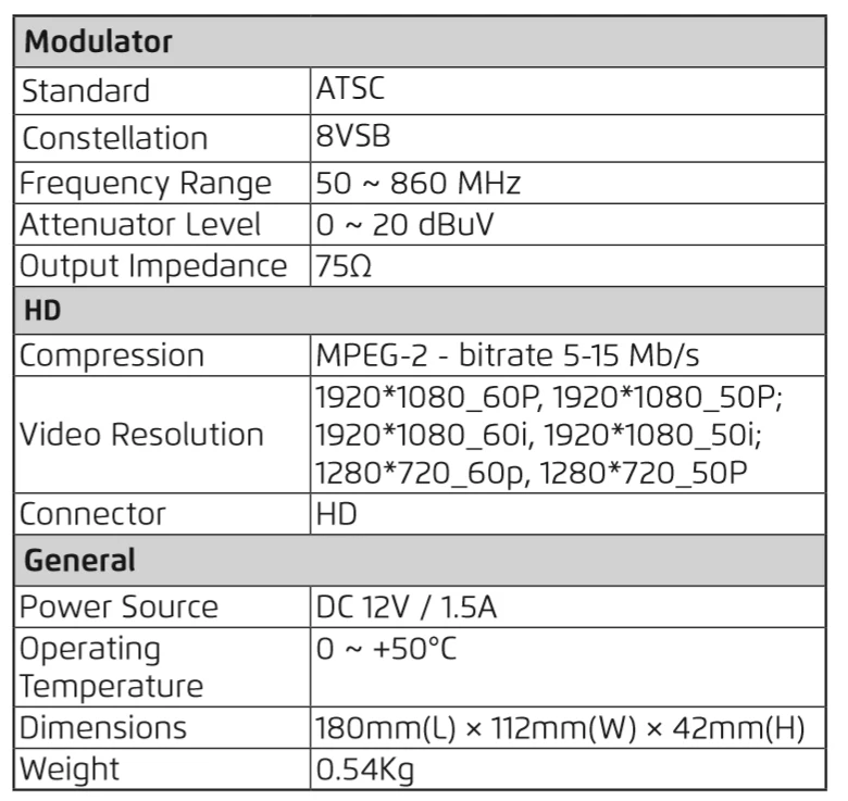 1. Поскольку модулятор использует кодировку MPEG-2, пользователи должны использовать сервис ATSC, который поддерживает стандартное MPEG-2-кодирование для нормального дисплея.