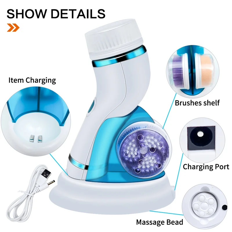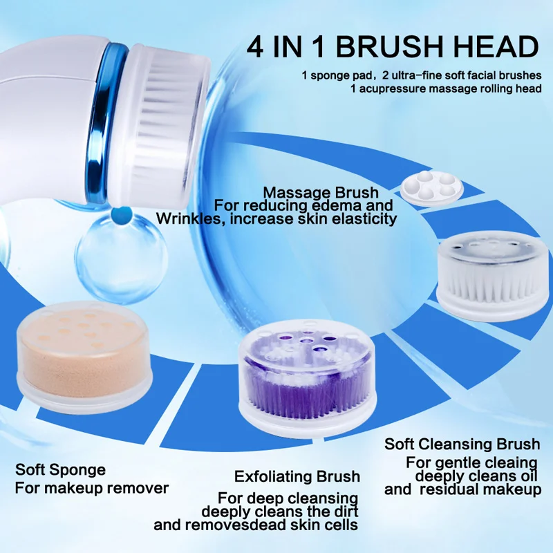 Основная система нашей машины работает с 3D звуковым движением для более глубокого очищения и лучшего продвижения производства коллагена. С 1 губчатой накладкой для простого удаления макияжа и грязи; 2 ультра тонких мягких кисти для лица для замены и полного отшелушивания, удаления масла и омертвевшей кожи; 1 акупунктурная Массажная Вращающаяся головка для похудения лица, уменьшает отечность и морщины, повышает эластичность кожи и способствует питанию ваших косметических кремов.