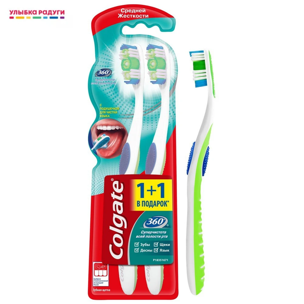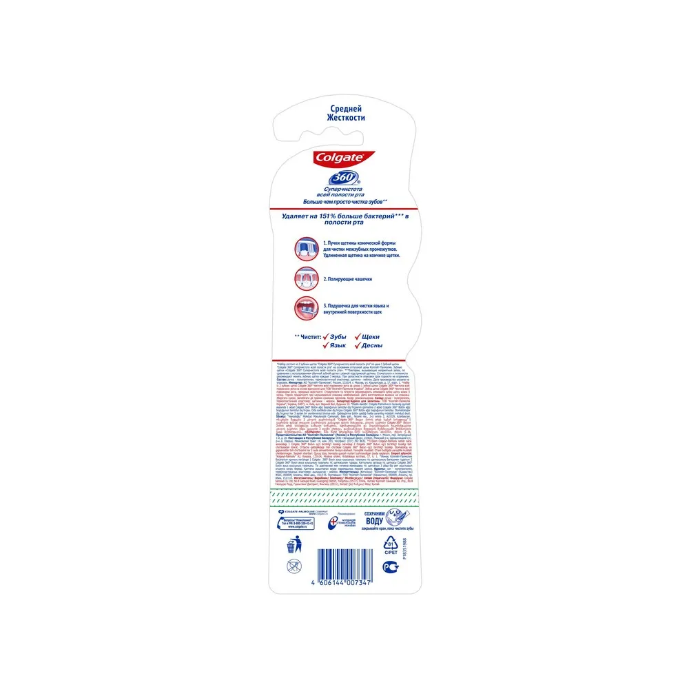 Описание от производителя:Так как 80% бактерий в полости рта скапливаются не на зубах, зубные щетки Colgate 360° созданы для суперчистоты всей полости рта - они эффективно чистят зубы, десны, щеки и язык.На оборотной стороне головки зубной щетки Colgate 360° "Суперчистота всей полости рта" находится подушечка для чистки языка и внутренней поверхности щек.Также Colgate 360° обладает специальной подстрижкой щетины, удлиненной щетиной на кончике и полирующими чашечками, они помогают удалять больше налета и потемнений на эмали по сравнению с обычной зубной щеткой с ровной подстрижкой щетины.Применение: Стоматологи и гигиенисты рекомендуют менять зубную щетку каждые 3 месяца.При целостности упаковки срок годности не ограничен.Состав:100% пластик.