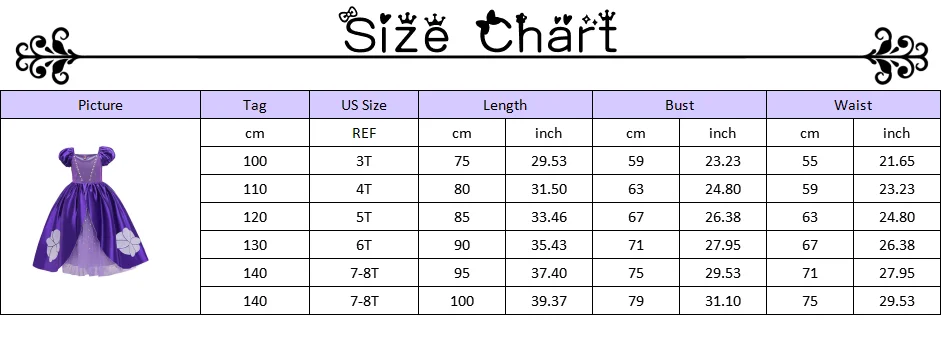 Цвет: фиолетовый Размер CN: 100-110-120-130-140-150 Для детей в возрасте: 2T, 3T, 4T, От 5 до 6 лет От 7 до 8 лет От 9 до 10 лет Материал: атлас, полиэстер, сетка Аксессуары: перчатки, палочка, корона, ожерелье, пожалуйста, выберите то, что вам нужно Принцесса: София Возраст: обычно 2T для детей 85-92 см, 3T подходит для малышей 93-100 см, 4T для детей 100-107 см, От 5 до 6 лет для детей 108-120 см, От 7 до 8 лет для детей 120-135 см, От 9 до 10 лет для детей 135-150 см