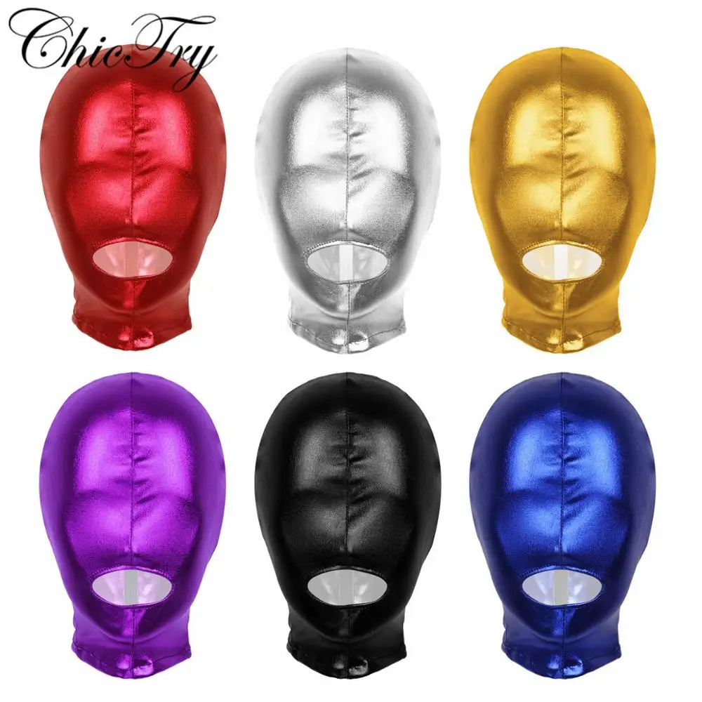 Взрослые Унисекс, мужские, женские, мужские блестящие металлические головные уборы с открытым ртом, маска на все лицо, капюшон для ролевых игр, костюм