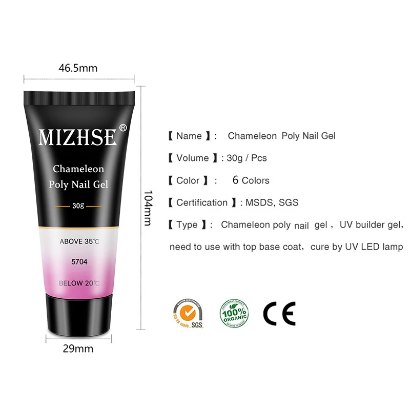 Характеристики: * Название бренда: MIZHSE * Материалы: УФ-светодиодный полигель для ногтей * Объем: 30 мл * Сертификация: MSDS, SGS * Инструменты для отверждения: УФ-лампа, светодиодный светильник, УФ/светодиодный CCFL лампа