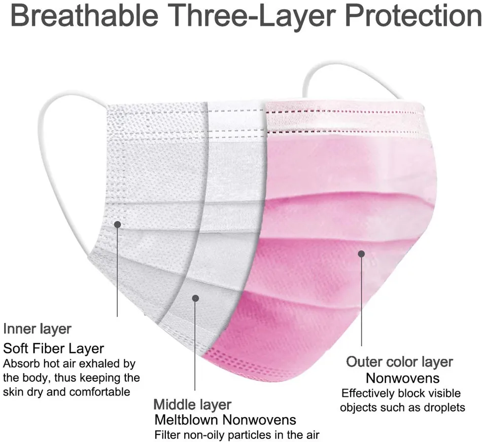 Маска для рта 3-слойная розовая одноразовая для взрослых, маски с з...