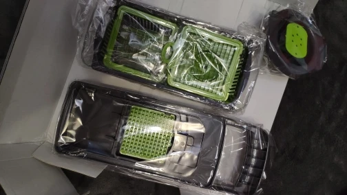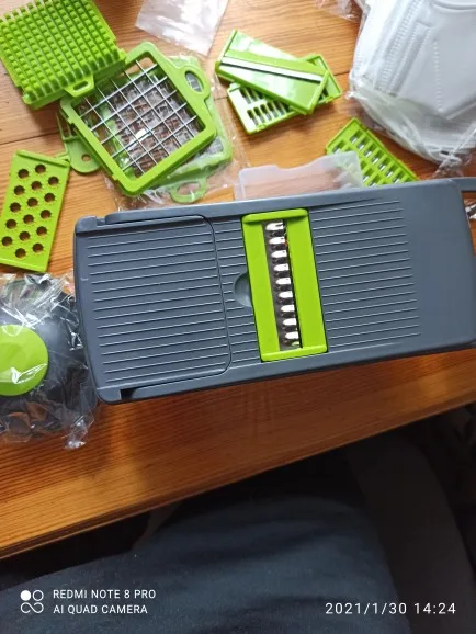 Доставили в течении 5 дней до квартиры! Пришла целиковая, без каких-либо повреждений. Вечером попробовал нарезать кубики из огурца и яиц. Яйца в лёгкую режит, а вот огурец, конечно, посложнее. Предварительно лучше очистить от кожуры, чтобы был помягче. А так в целом аппарат прикольный! Пластик жёсткий, с нагрузкой справляется. Китаем не пахнет. Лезвия у насадок и ножей острые, порезаться легко, что я и сделал при распаковке) Из минусов, что я заметил это то, что лоток, куда всё сыпется, плохо крепится к основе. И то, что сетку для кубиков достаточно проблематично отмыть. В общем продуктивно использовать только тогда, когда надо много чего нарезать. Если что-то одно порезать, то использовать не имеет смысла. В целом понравилось, советую. Для сравнения цены в интернете на этот набор от 3000 руб))