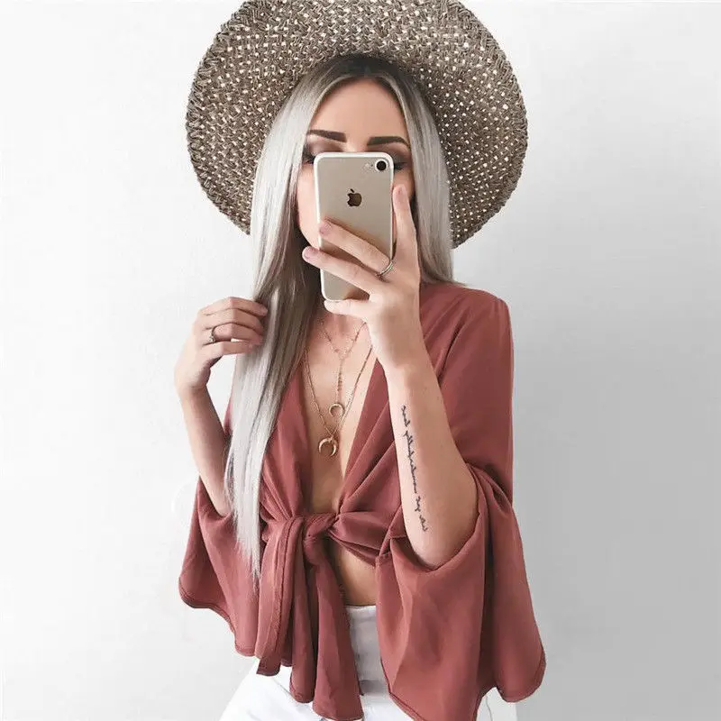 Новые Сексуальные женские бандажные топы, сексуальные футболки с глубоким v-образным вырезом, модные праздничные топы с расклешенными рукавами, сексуальная одежда в стиле кэжуал