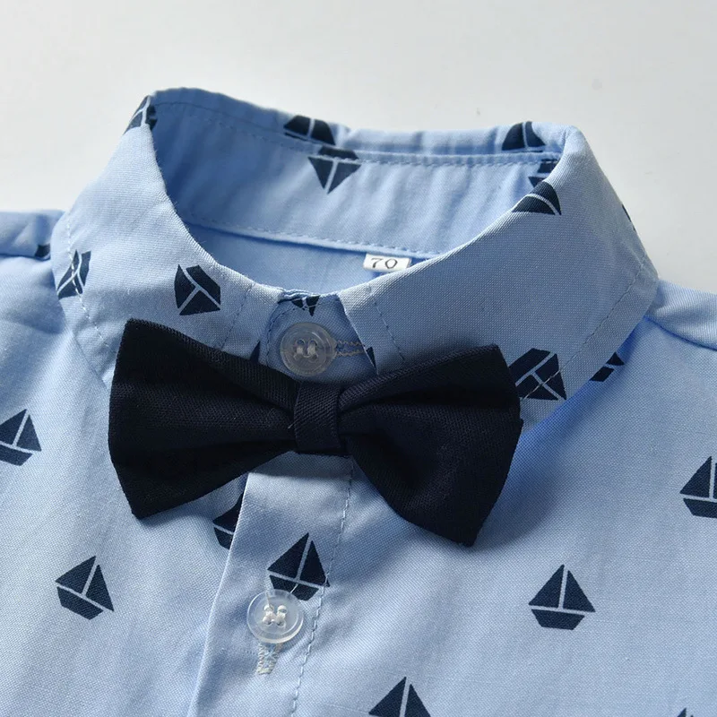 Рубашка для маленьких мальчиков праздничный костюм с бантом осенний комплект одежды для новорожденных мальчиков, синяя рубашка Топ + штаны на подтяжках