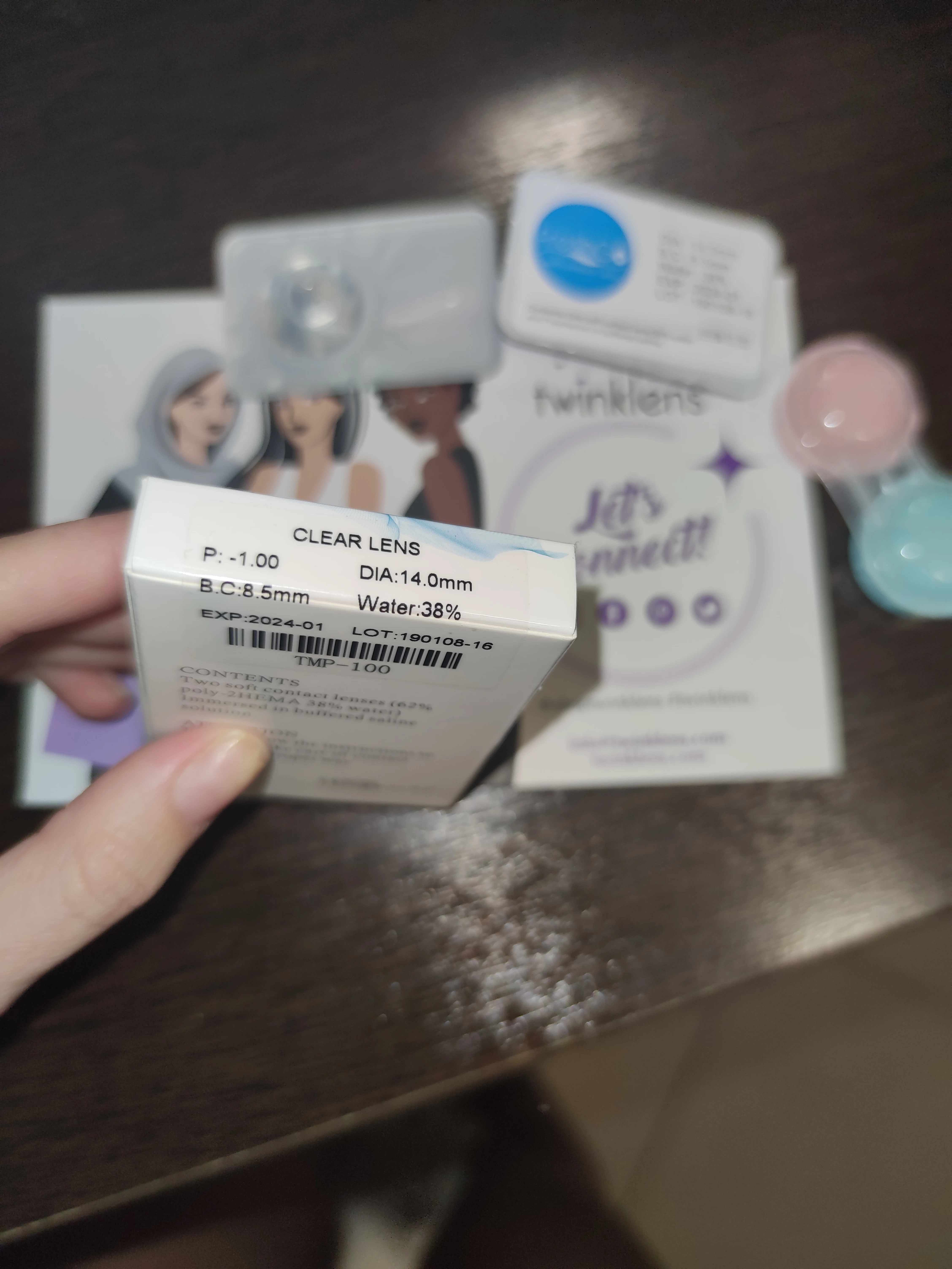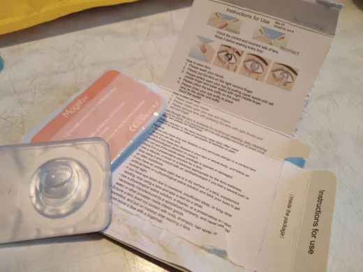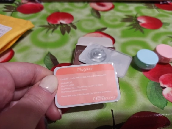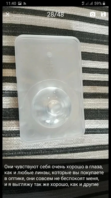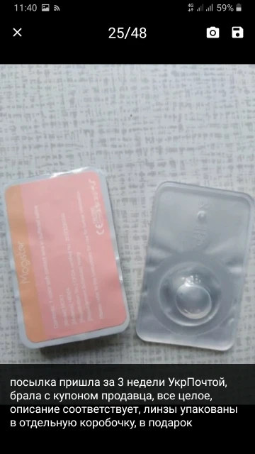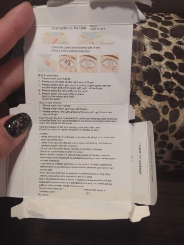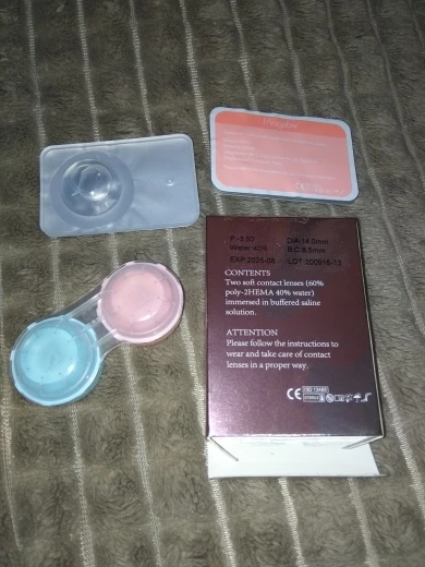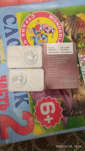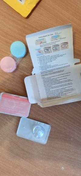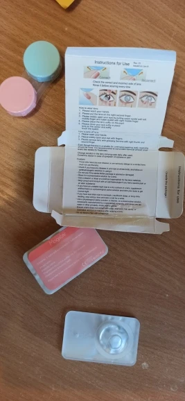 Хорошие линзы, прозрачные, бесцветные (их абсолютно не видно в упаковке в растворе). В картонной упаковке были 2 качественно упакованные линзы в отдельных ёмкостях. Внутри коробки видно, видимо, инструкцию на английском языке. Неожиданным приятным бонусом было то, что продавец положил подарок – контейнер для линз, который без изъянов, не протекает, подписан "L" и "R". А так как контейнеры положено менять часто, то это очень полезный и нужный подарок. За это продавцу отдельное огромное "Спасибо"!)) Постоянно ношу линзы и эти приобрела заранее, поэтому пока не распаковывала и не примеряла.