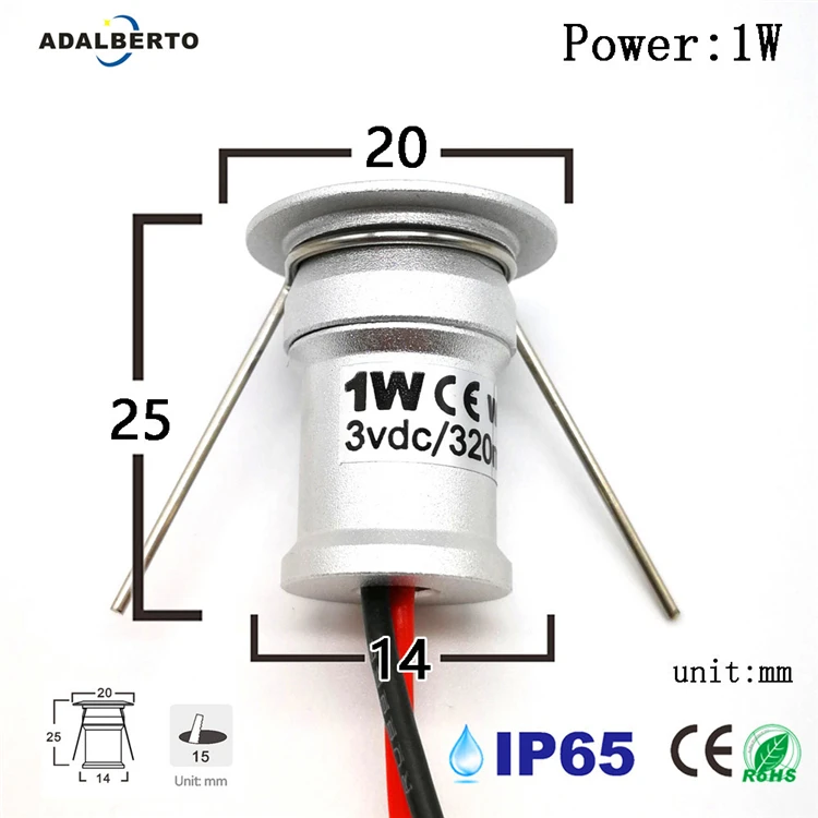 Мощность: 1 Вт Epistar светодиодный Люмен: 95 лм Входное напряжение: DC12V или DC3V Светильник Угол луча: 30 ° 120 ° Класс защиты: IP 65 Основной материал: алюминий Размер корпуса: D20 мм x25 мм Кабель: 47 см тефлоновый кабель Рабочая температура: -25 °C ~ + 45 °C Гарантия: 3 года с CE и ROHS, срок службы чипа 35 000 часов Цветовая температура: теплый белый (2700-3000K), натуральный белый (4000-4500K), холодный белый (6000-6500K) Использование: комнатный декоративный светильник, KTV комнаты, лестницы указывающий светильник, шкаф витрина светильник, и другие DIY дизайн светильник ing