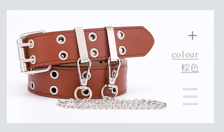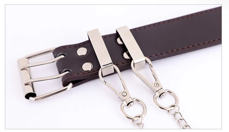 Ремень в стиле панк для мужчин и женщин, модный чёрный винтажный кожаный пояс с пряжкой-цепочкой и двумя люверсами, для джинсов