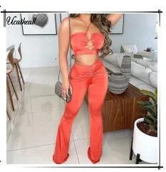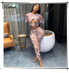 Сетчатый комплект из двух предметов с пузырьковыми рукавами, топ и брюки, спортивный костюм на одно плечо, ажурные асимметричные сексуальные костюмы из двух предметов