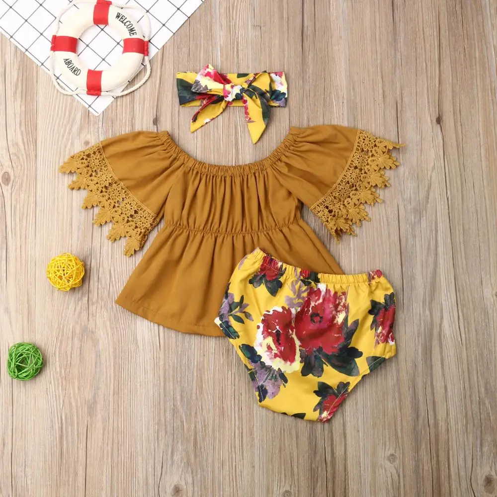 Комплект одежды для маленьких девочек, однотонный кружевной топ с открытыми плечами, Короткие штаны с цветочным рисунком, повязка на голову, Одежда для новорожденных, 3 шт., От 0 до 5 лет