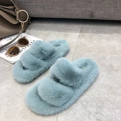 Тапки женские с мехом, теплые пушистые меховые тапочки в Корейском стиле, без застежки, плоская подошва, сланцы, зимние