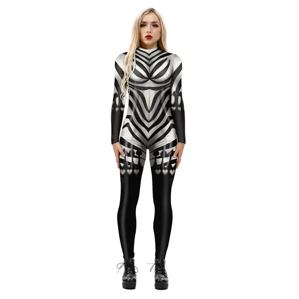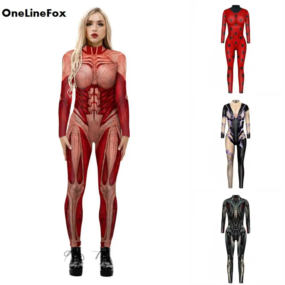 OneLineFox, страшный ужас, боди, большой рот, готический скелет, принт, костюмы для косплея, зентай, костюм на Хэллоуин, женский сексуальный комбинезон