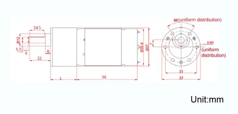 Характеристики: Примечание: Более низкая скорость, больший крутящий момент Модель: 37GB555 Номинальное напряжение: 12 В/24 В постоянного тока Скорость без нагрузки: 10 об/мин, 20 об/мин, 30 об/мин, 50 об/мин, 100 об/мин, 150 об/мин, 200 об/мин, 300 об/мин, 500 об/мин, 600 об/мин Мощность: 15 Вт Диаметр двигателя: 35,8 мм Длина корпуса двигателя: 56 мм Диаметр выходного вала: 6 мм Длина выходного вала: 16 мм Диаметр коробки передач: 37 мм Длина коробки передач: см. Таблицу Регулировка скорости: Да CW/CCW: Да Он может работать непрерывно в течение 24 часов Применимая промышленность: циркуляционный вентилятор. Увлажнитель воздуха, очиститель воздуха, нагреватель воздуха, печатная машина, медицинское оборудование, автоматическая упаковочная машина. Автоматизированные производственные линии и т. Д. Посылка включает в себя: Мотор x1 Размер и параметры: