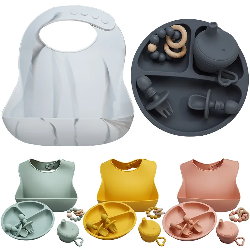 2020 новый продукт, детский набор посуды, Детские одноцветные нагрудники с браслетом, прорезыватель, Детская силиконовая тарелка и ложка