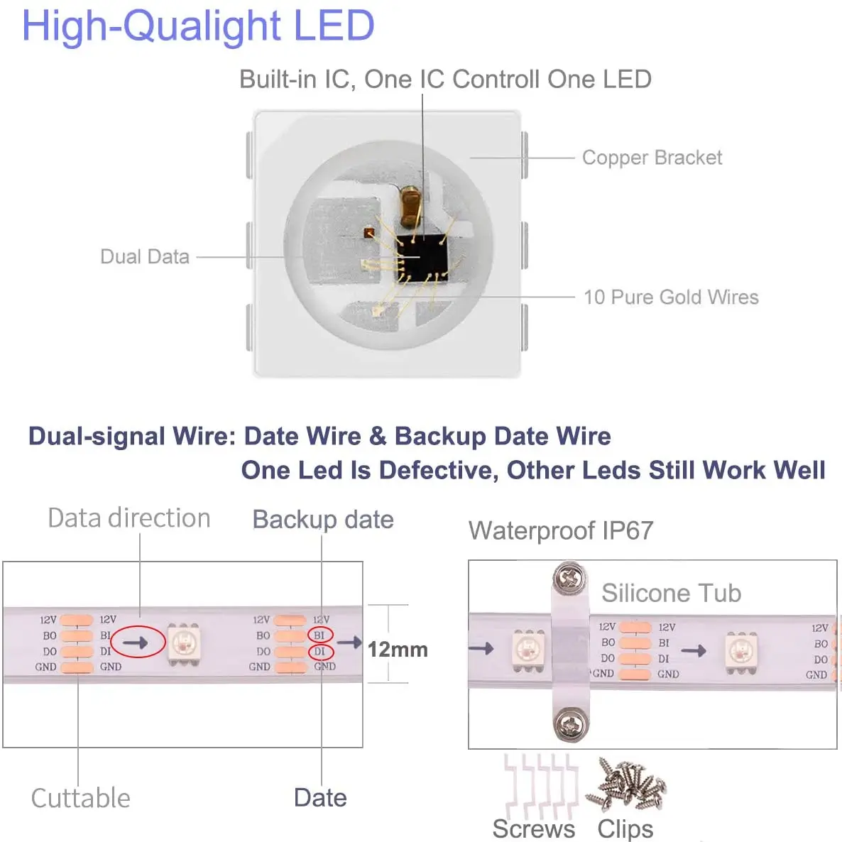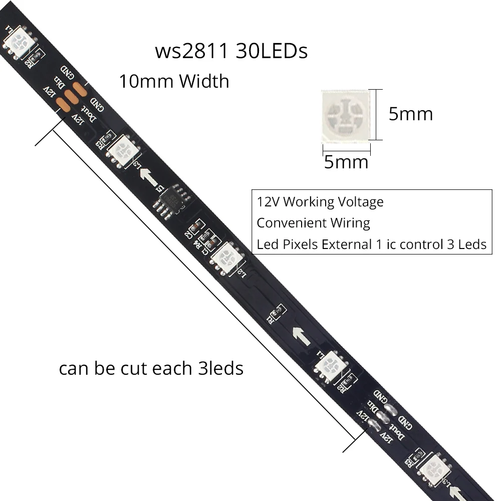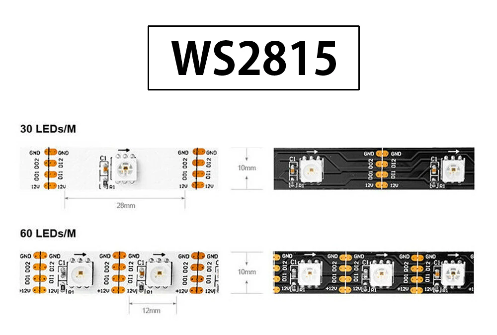 WS2815:Входное напряжение: ............. DC12V;Мощность: ....................... 30 светодиодов/м ---- 9 ватт/метр. ...................... 60 светодиодов/м ---- 18 ватт/метрСветодиодный ресурс: ........... WS2815 светодиодный (5050 SMD RGB светодиодный со встроенной улучшенной версией ws2811 ic)Светодиодный:. .............. Каждый светодиодный отдельно управляемый светодиодныйТип ИС:. ................... Улучшенная версия WS2815 IC (Встроенная внутри 5050 smd rgb led)ИС:. .................(1 IC дисков 1 светодиодный чип);Пиксели:. ........ 30/60/метр;Шаг:. ....................... 16,6 мм (1000/64);Серые Весы:. .............. 256;Биты/Цвет:. ................ 8 бит/цвет;FPC ширина: .............. 30 светодиодов/м ---- 10 мм. ...................... 60 светодиодов/м ---- 10 ммЦвет FPC:. ........ Белый/Черный PCBСтепень защиты. ..... IP30/ IP65 /IP67Цвета:. ...................... Полноцветный RGB, изменение цвета мечты;Сокращение: ..................... каждый светодиодный нарезается;Посылка:. .................. В антистатическую сумку, IP30 IP65 с 3 м липкой лентой на задней части (IP67 без 3M клей)Рабочая температура ...............-40 ~ 70 °CТемпература хранения ...............-50 ~ 80 °CИсточник жизни. ................ 50000 часовСоединитель. .............. 4-контактный соединитель Клеммная пара(Красный: 12 В мощность, Зеленый: Дата линия, Синий: дата в режиме ожидания, черный: GND)