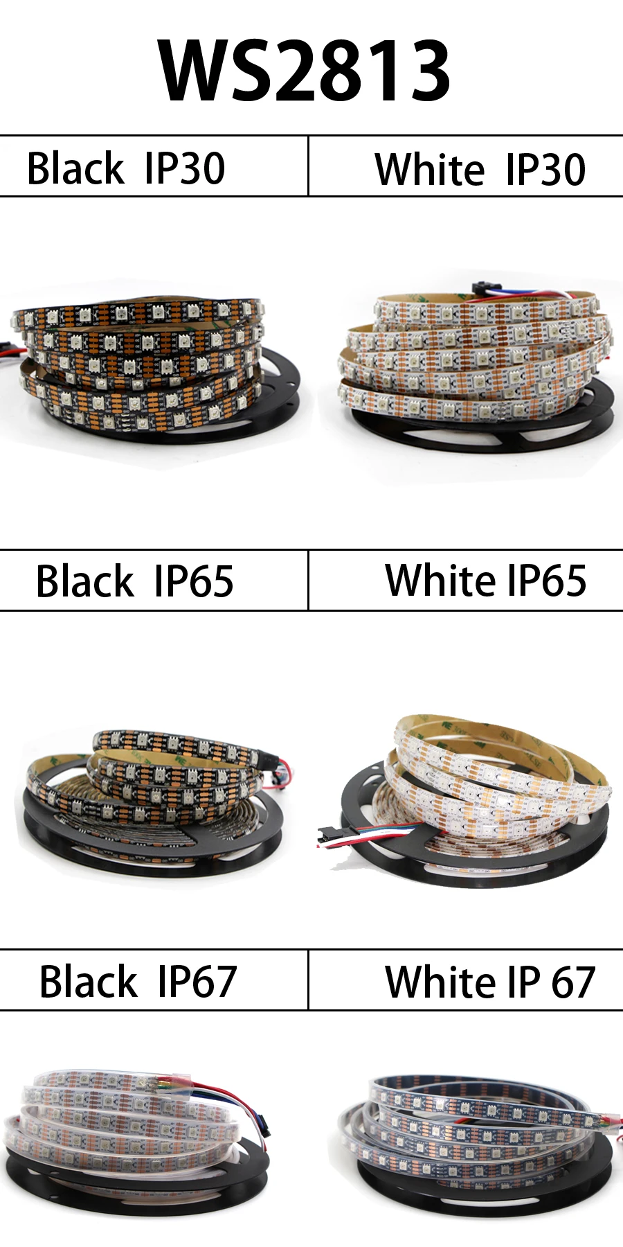 WS2813 Светодиодная лента:Входное напряжение: 5 В постоянного токаМощность: 30 светодиодов/м --- 9 Вт/метр/60 светодиодов/м --- 18 Вт/метрСветодиодный ресурс: WS2813 светодиодный (5050 SMD RGB светодиодный со встроенной улучшенной версией ws2811 ic)Светодиодный: Каждый светодиодный отдельно управляемый светодиодныйТип IC: улучшенная версия ws2813 IC (встроенный светодиод 5050 smd rgb)ИС: (1 IC дисков 1 led чип)Пиксели: 30 светодиодов/60 светодиодовШаг: 16,6 мм (1000/64)Серые Весы: 256Цвет s: полный цвет RGB, изменение цвета мечтыБиты/Цвет: 8 бит/цветЦвет FPC: черный/белыйFPC ширина: 30 светодиодов/м --- 10 мм/60 светодиодов/м --- 10 ммСтепень защиты: IP30 не водонепроницаемый/IP65 Водонепроницаемый в силиконовом покрытии/IP67 Водонепроницаемый в силиконовой трубкеМожно резать: Каждый светодиодныйПосылка: в антистатическую сумку, IP30 IP65 с 3 м липкой лентой на задней части (IP67 без 3 м липкой), каждый пропилен-каучука прокладки с Один Бесплатный штепсельный разъем для разъемаРабочая температура: -40 - 70 °CТемпература хранения: -50 - 80 °CСрок службы от источника энергии: 50000 часовРазъем: 4-контактный соединитель (красный: мощность 5 В, Зеленый: линия даты, синий: линия даты в режиме ожидания, черный: GND)Контроллеры повторной команды: T-1000s,T-8000A;T-100K;T-200K;T-300K