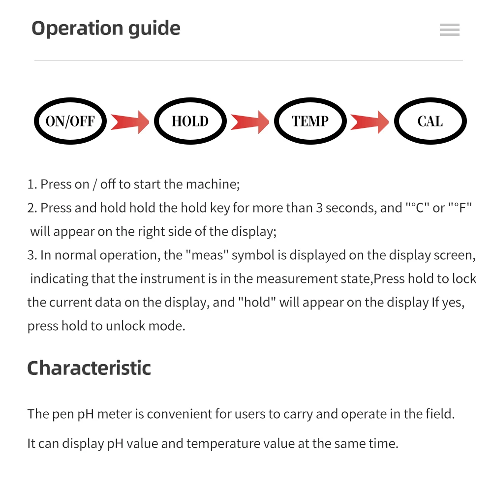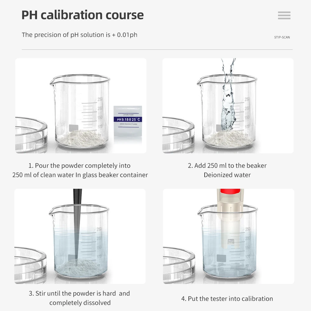 Калибровка: pH: автоматическая калибровка с тремя точками (6,86 & 4,00 & 9.18pH); TDS: 1413 мкс/см; EC: 1413 мкс/см