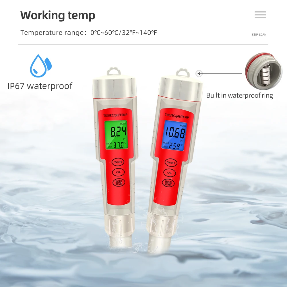 Измеряет потенциал водорода (pH), электропроводность (EC), общее количество растворенных твердых веществ (TDS) и одновременную температуру.