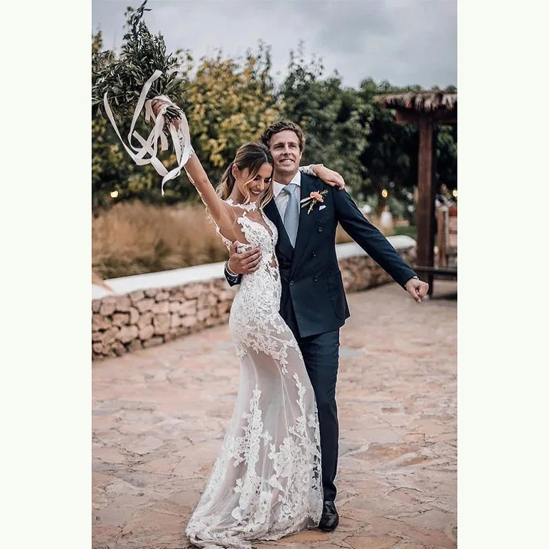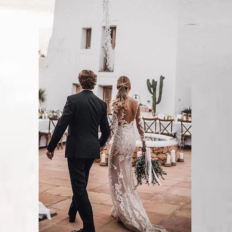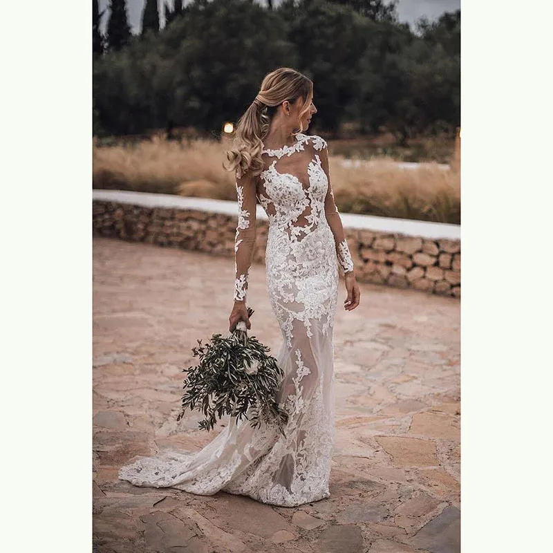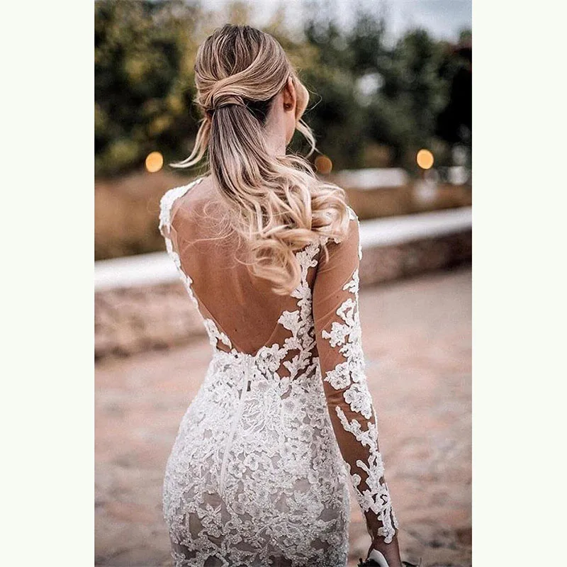Свадебное платье, белое кружево, с длинным рукавом, с открытой спиной, с аппликацией