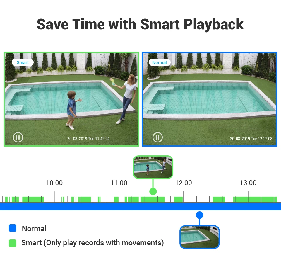 Умное воспроизведение обеспечивает видео с движениями в выбранных областях и период. Таким образом, вам не придется тратить время на проверку кадра за кадром. Намного проще найти то, что вам нужно в записях.