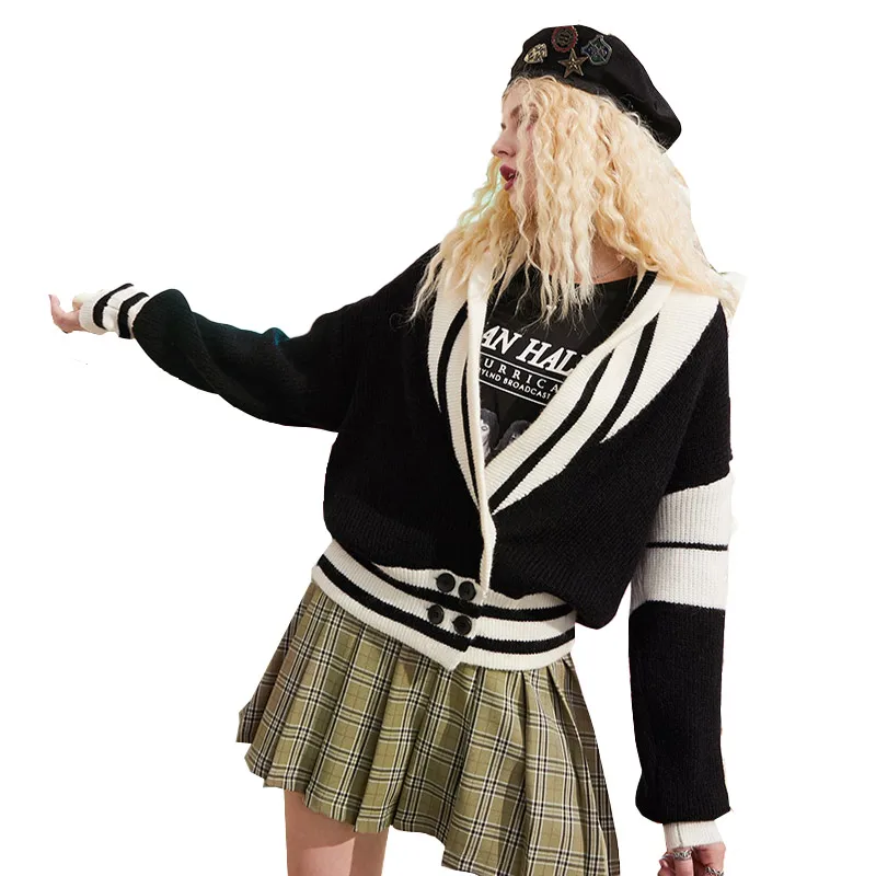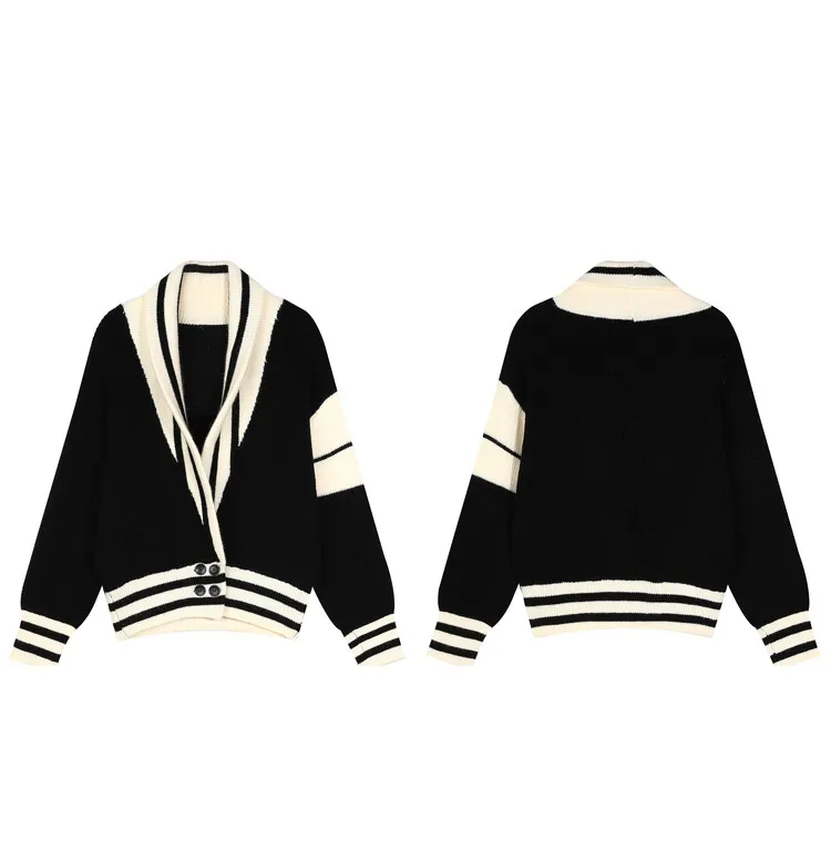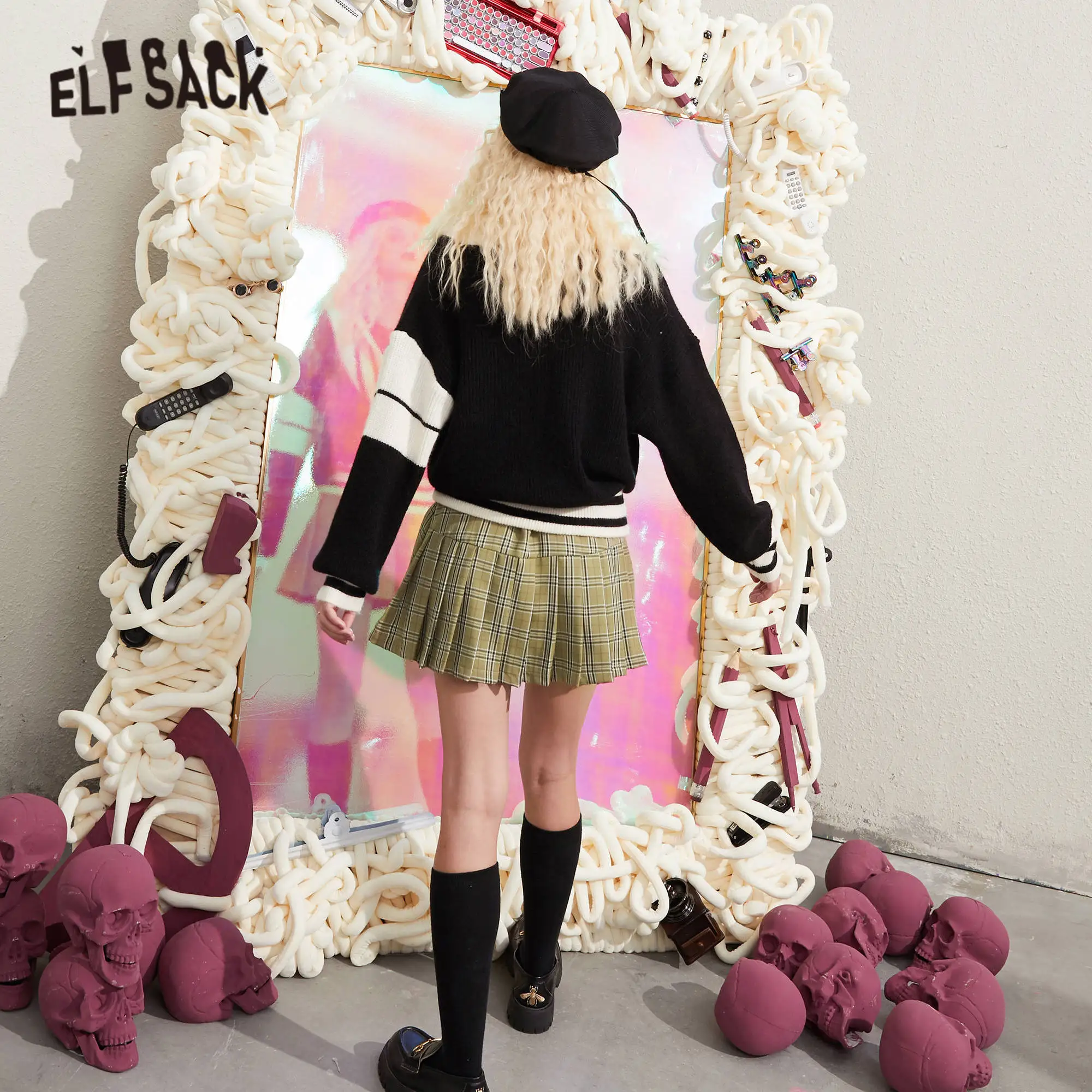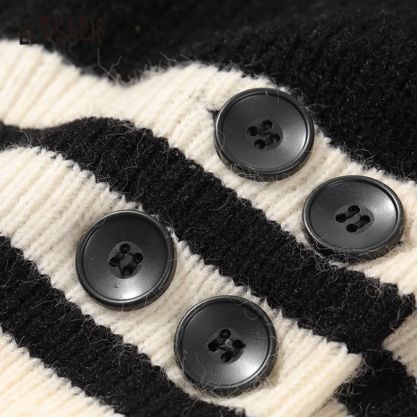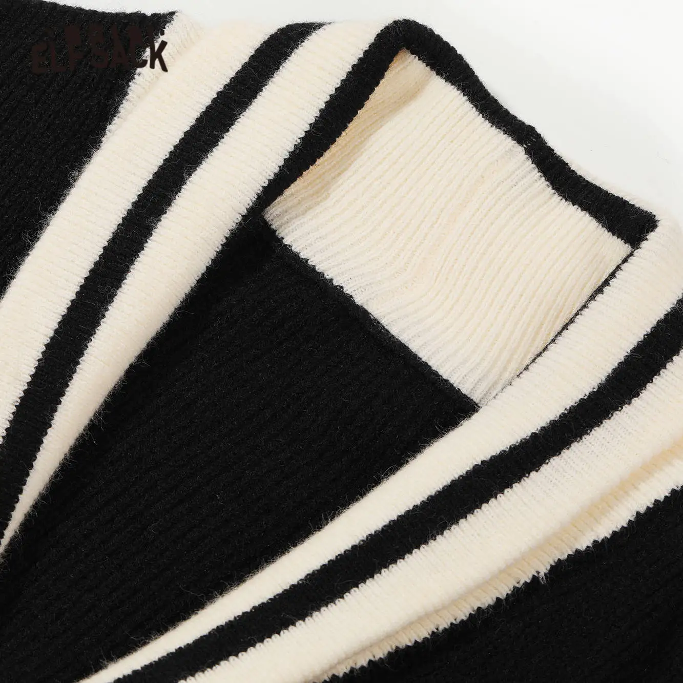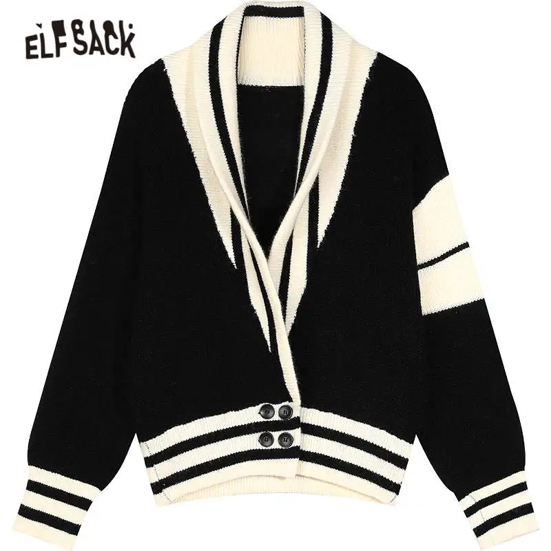 ELFSACK, черные полосатые вязаные повседневные женские кардиганы с цветными блоками, осень 2020, ELF, двойная шикарная на пуговицах, корейский женский топ, повседневный преппи