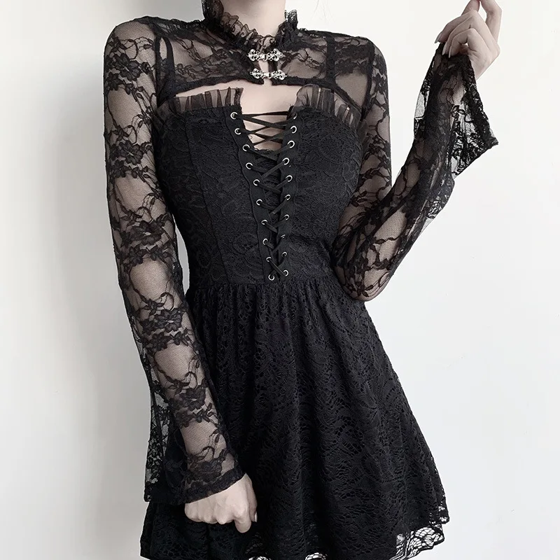 Женское кружевное мини-платье, черное готическое платье на тонких б...